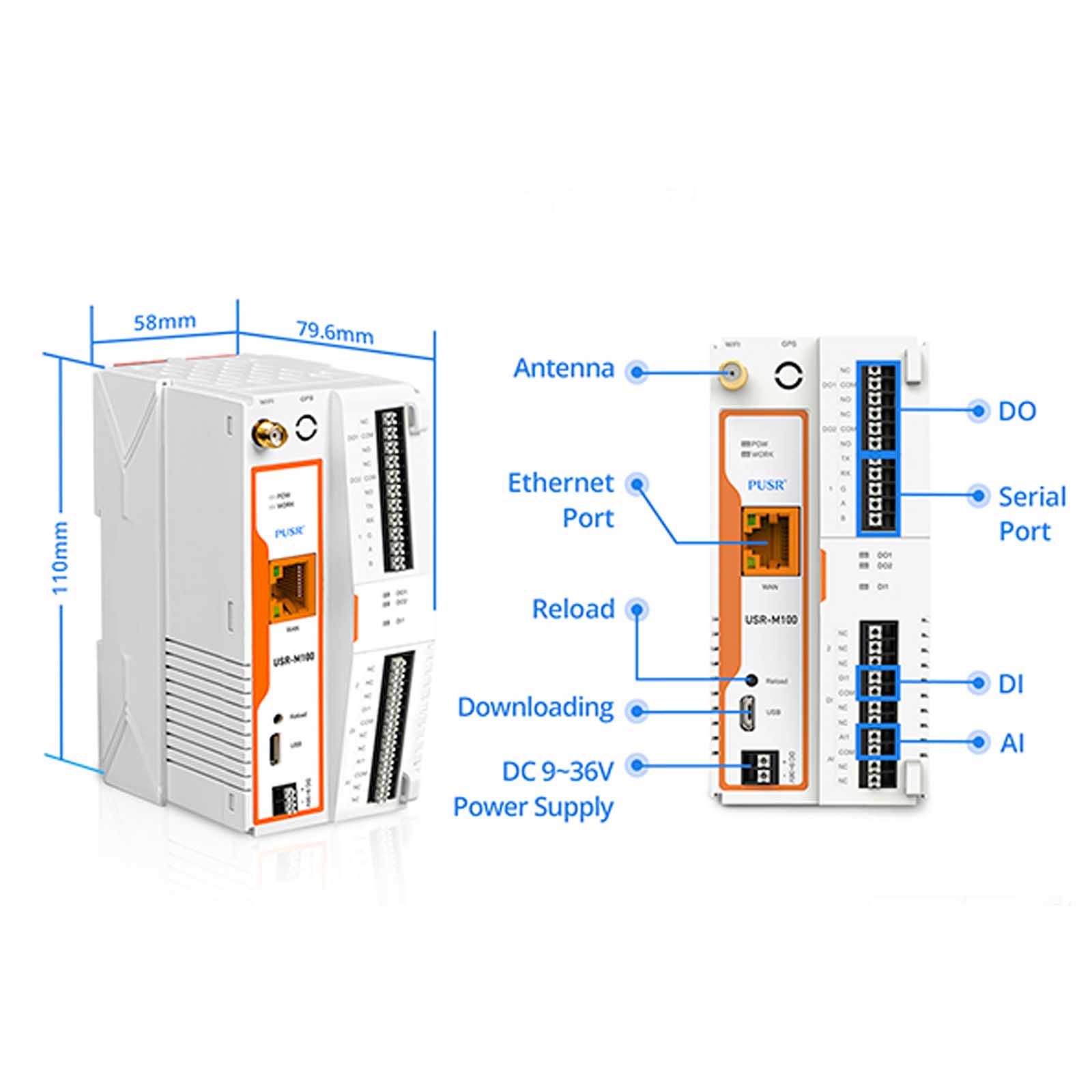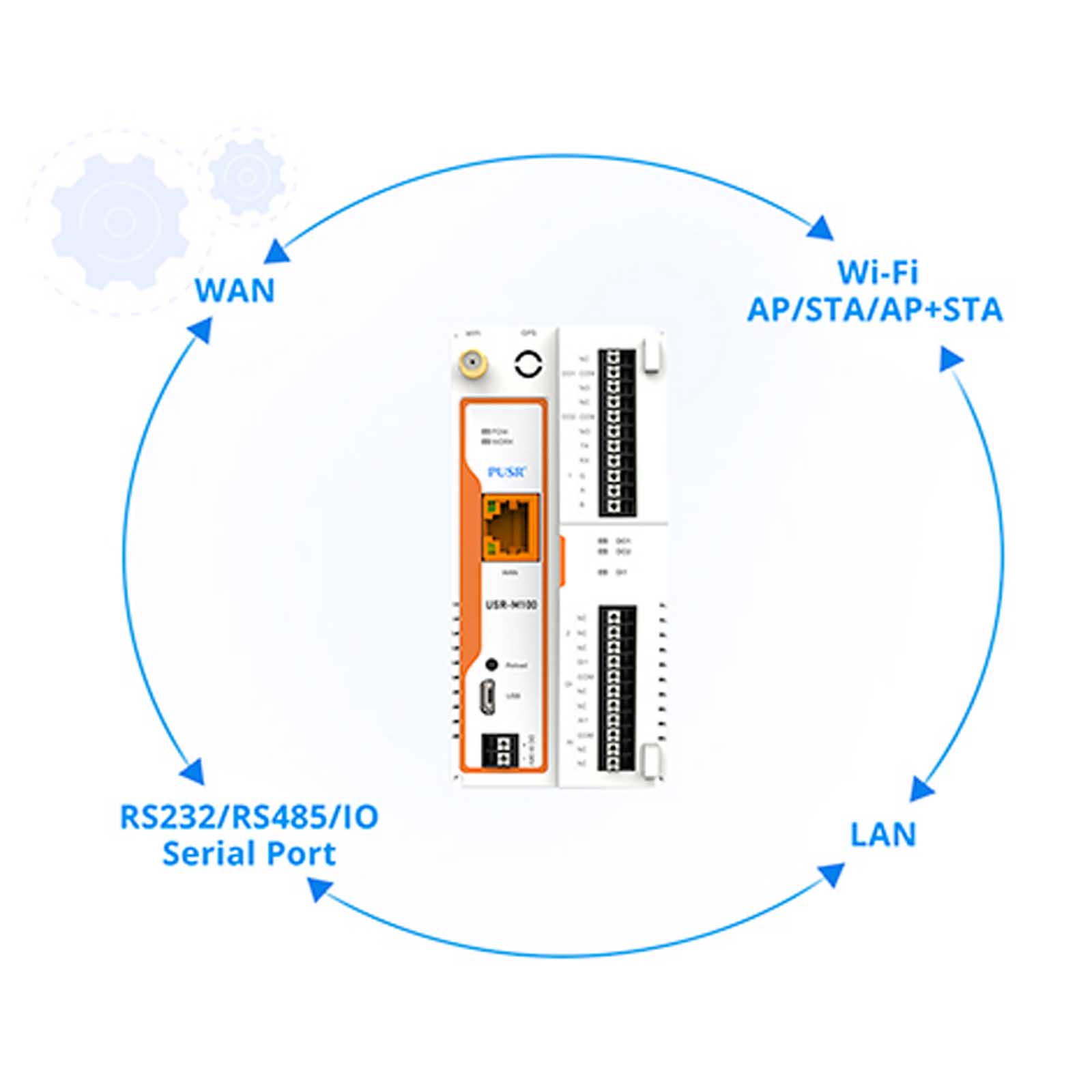 USR-M100 to inteligentna brama IoT z kompleksowymi funkcjami, takimi jak wsparcie dla wejść/wyjść oraz interfejs RS-485/232/Ethernet. Jest to zaawansowany modułowy produkt RTU z unikalnym projektem sprzętowym i oprogramowaniem, dzięki czemu stanowi idealne rozwiązanie dla różnych zastosowań w zakresie zbierania danych przemysłowych.
