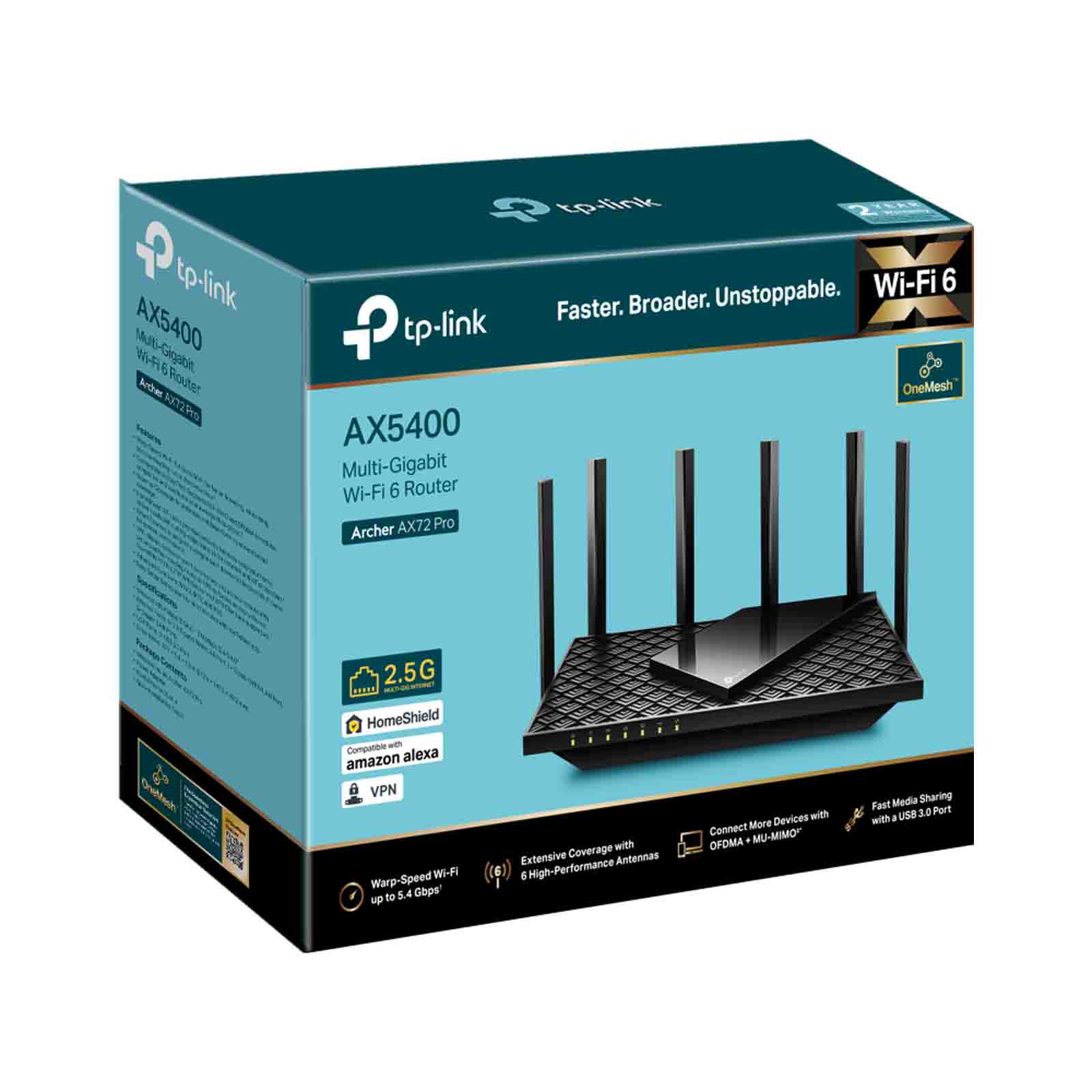 Router wyposażony został w sześć anten, które w połączeniu z technologią Beamforming, modułem front-end o dużej mocy i rozwiązaniem 4T4R zapewniają dostęp do niezawodnej sieci bezprzewodowej na powierzchni całego domu oraz płynne i stabilne połączenia dla wszystkich użytkowników. Ponadto AX72 Pro wspiera technologie OFDMA i 4x4 MU-MIMO, które umożliwiają podłączenie do sieci bezprzewodowej większej liczby urządzeń i widocznie zmniejszają opóźnienia w transmisji. Archer AX72 Pro obsługuje technologię OneMesh, która zapobiega utratom połączenia z siecią i opóźnieniami w transmisji podczas przemieszczania się po domu. Urządzenie zasilane jest napięciem 12 V DC (zasilacz dołączono w zestawie).