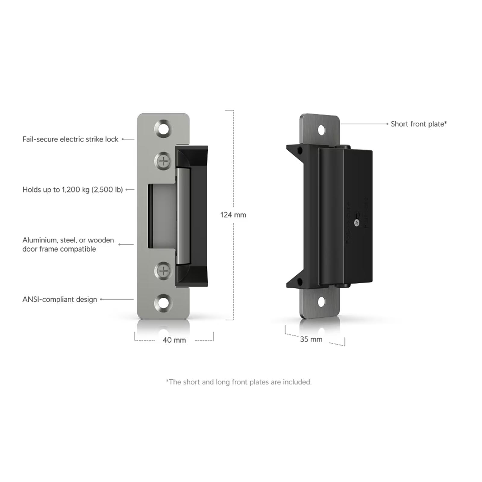 Ubiquiti Access Lock Electric (UA-Lock-Electric) to bezawaryjna blokada elektrozaczepu podłączana do Ubiquiti Access Hub (UA-Hub). Access Lock Electric może zabezpieczyć drzwi. Blokada musi być podłączona do UnFi Acess Hub. Można go zainstalować na drewnianej, stalowej lub aluminiowej ramie drzwi. W zestawie znajdują się krótki długi panel przedni. Do obsługi UniFi Access wymagane jest jedno z poniższych urządzeń: