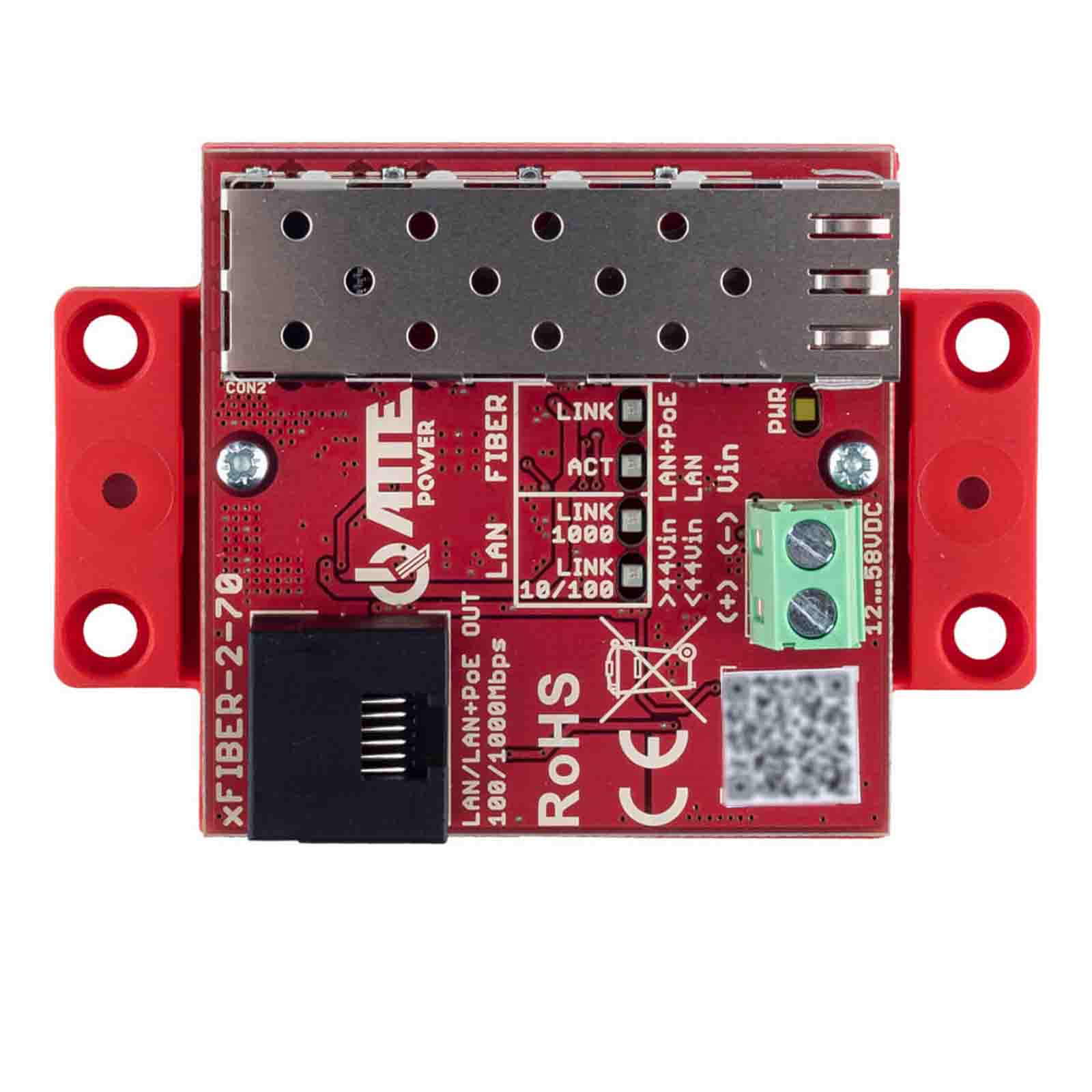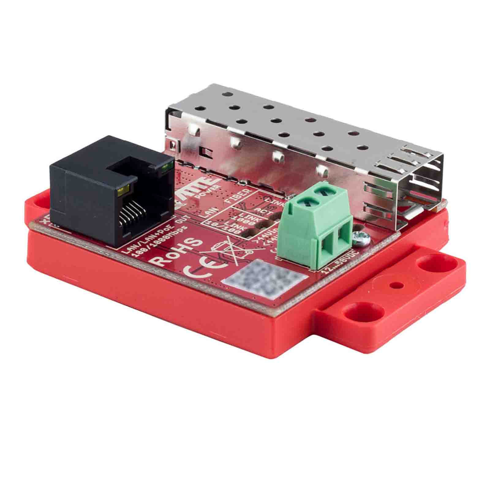 ATTE xFIBER-2-70 to gigabitowy konwerter Ethernet - SFP dedykowany do systemów telewizji przemysłowej IP. Stosując dowolną kompatybilną ze standardem IEEE 802.3z wkładkę SFP mamy możliwość dostosowania parametrów toru optycznego do wymogów instalacji (np. współpraca z światłowodami jednomodowymi lub wielomodowymi). W połączeniu z zasilaczami APS/AUPS oraz ekstenderami APT/xPoE umożliwia łatwą budowę punktów dystrybucyjnych dla rozległych instalacji CCTV opartych o okablowanie światłowodowe. Moduł może być zasilany wyłącznie poprzez złącze śrubowe napięciem z zakresu 12-58VDC. Port gigabit LAN może obsługiwać urządzenia zasilane z PoE pracujące w standardzie 802.3af/at oraz PASSIVE (dla Vin >44VDC). Po podłączeniu odbiornika następuje automatyczny wybór standardu zasilania PoE. Niewielkie rozmiary umożliwiają zabudowę urządzenia w dowolnej obudowie, jednak najwygodniejszym sposobem montażu, są dedykowane obudowy serii ABOX, oraz blachy montażowe, wyposażone w otworowanie systemowe w rastrze 10,8mm. Systemowe rozwiązanie pozwala na pionowy lub poziomy montaż wybranych urządzeń w dowolnej, otworowanej części obudowy lub blachy montażowej. Najważniejsze cechy:
