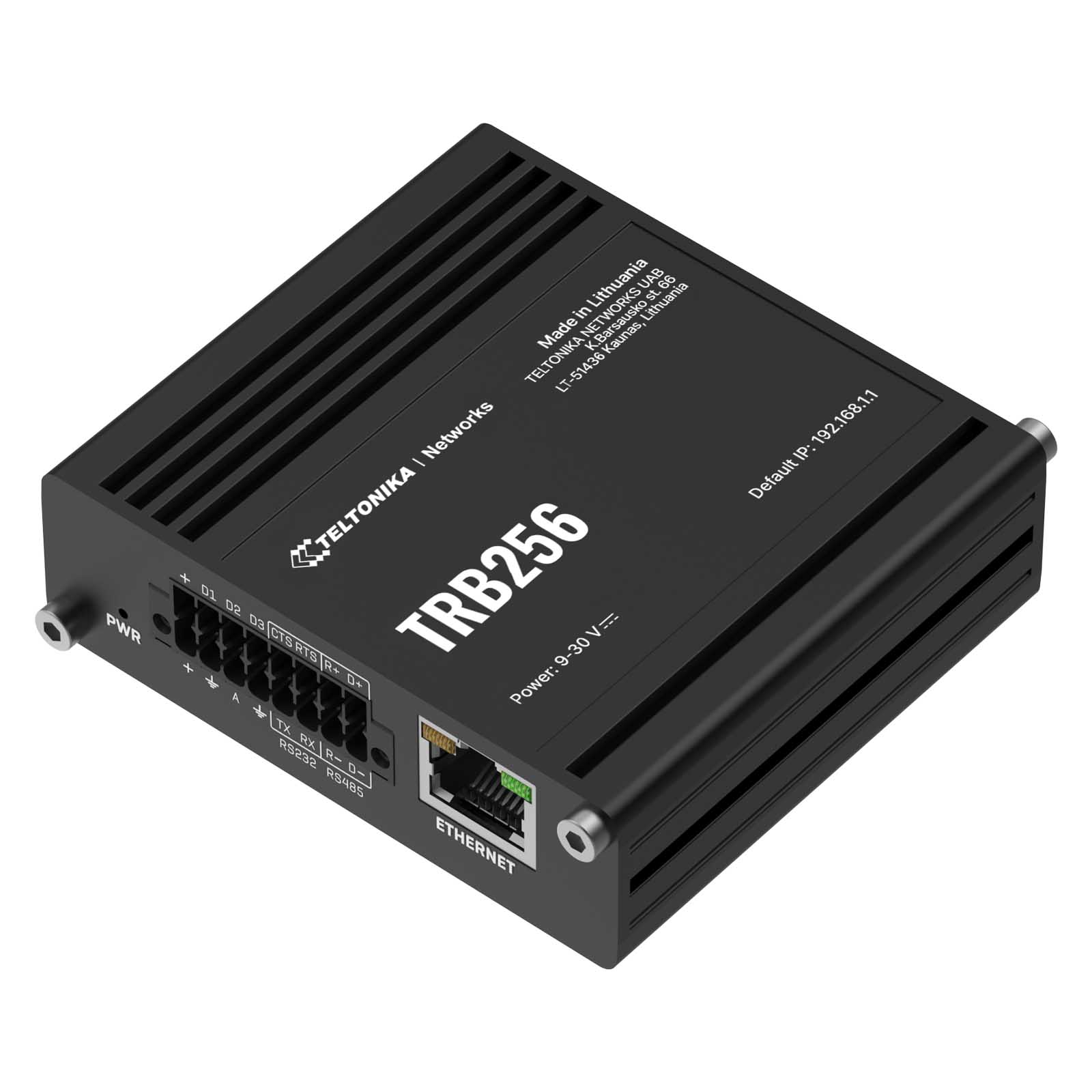 Teltonika TRB256 to kompaktowa, przemysłowa bramka LTE Cat M1/NB-IoT wyposażona w port Ethernet, blok złączy zawierający piny dla wejść/wyjść, RS232, RS485, GPS i oprogramowanie RutOS dla zaawansowanych rozwiązań sieciowych.