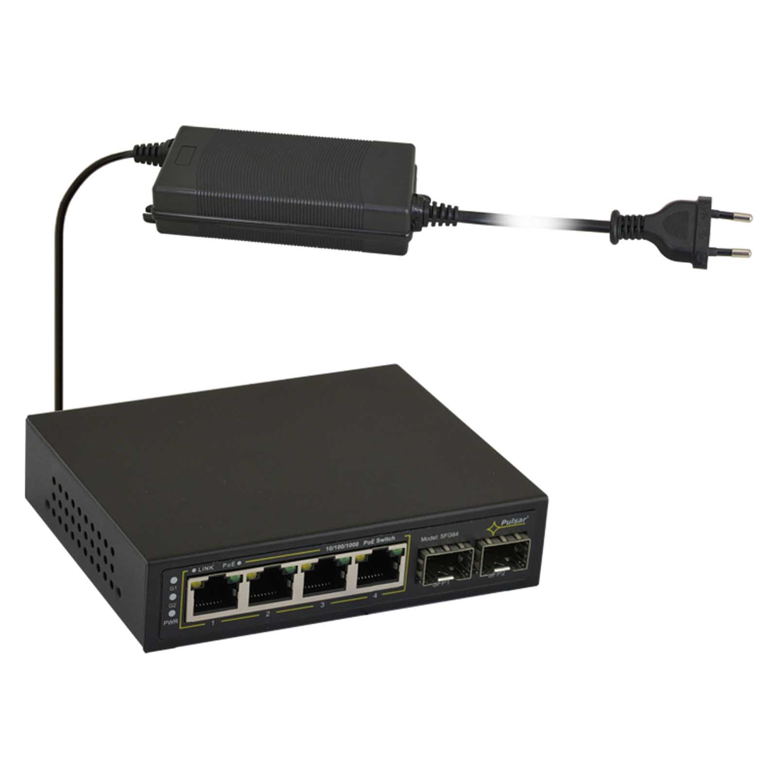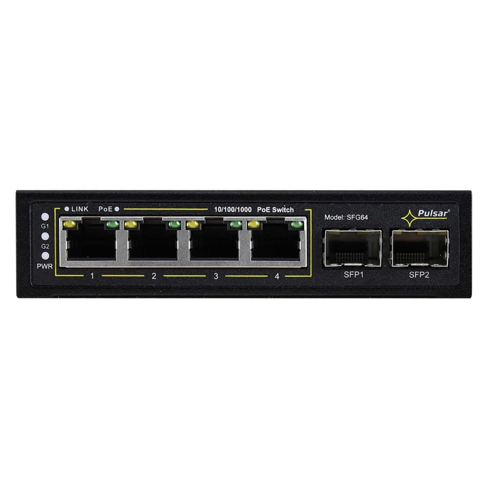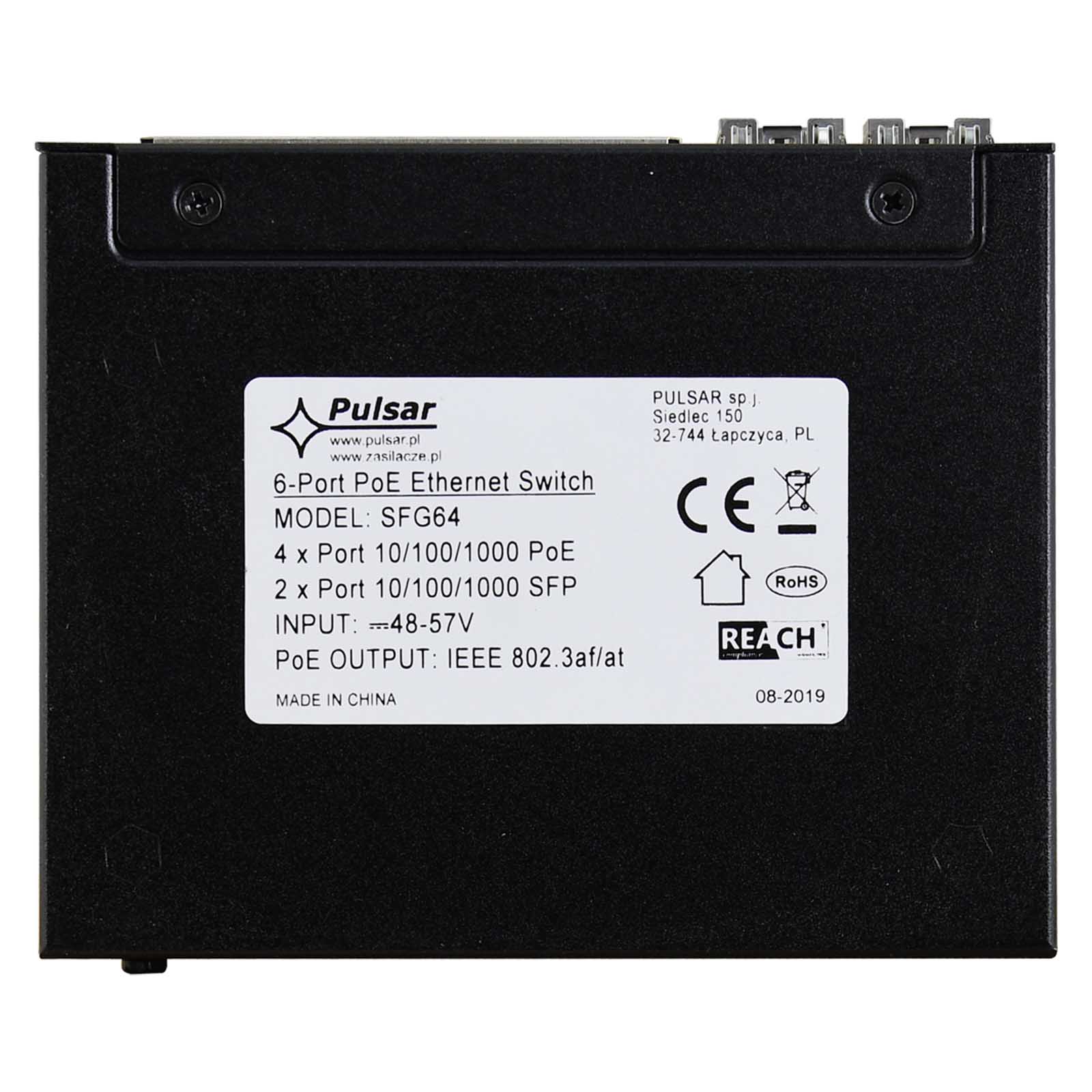 Pulsar SFG64 to 6-portowy switch PoE przeznaczony do zasilania 4 kamer IP pracujących w standardzie IEEE 802.3af/at. Switch na portach od 1 do 4 posiada funkcję automatycznej detekcji urządzeń zasilanych w standardzie PoE/PoE+.