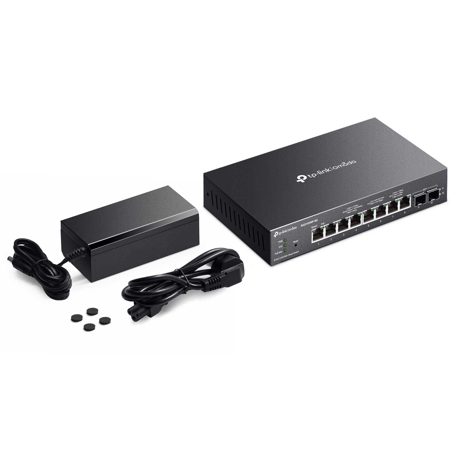 TP-Link SG2210XMP-M2 to przełącznik Smart Omada wyposażony w 2x sloty SFP+ 10 Gb/s oraz 8x portów 2.5G Gigabit Ethernet zgodnych z PoE+ 802.3at/af, o budżecie PoE o łącznej mocy 160W.