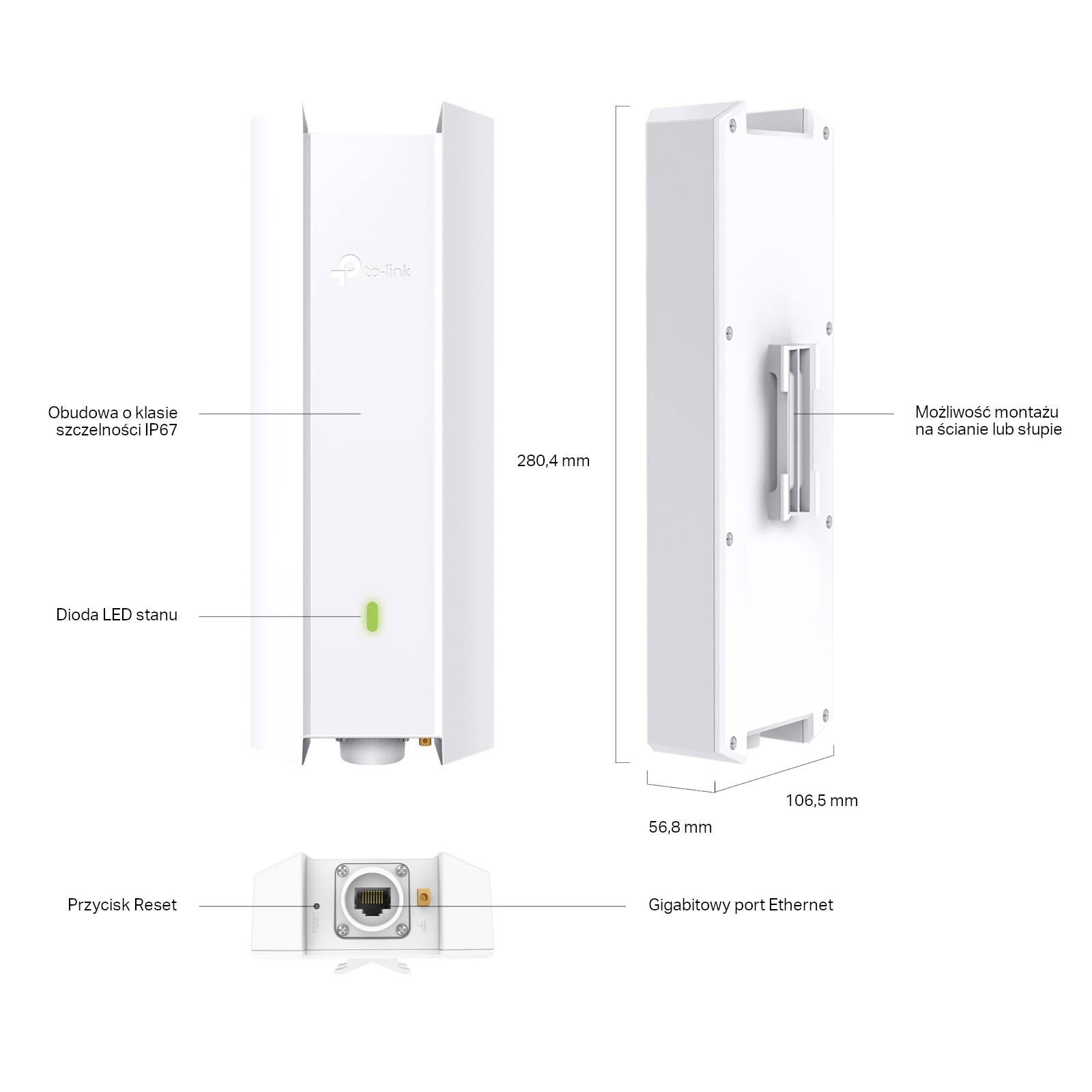 TP-Link EAP623-Outdoor HD to punkt dostępowy zaprojektowany z myślą o użytku na zewnątrz i wewnątrz budynków (stopień ochrony IP67). Jego maksymalna teoretyczna przepustowość WiFi to 1.8 Gb/s (574 Mb/s w paśmie 2,4 GHz i 1201 Mb/s w 5 GHz), umożliwiając pracę w obu pasmach jednocześnie. Obsługuje standardy IEEE 802.11ax/ac/n/g/b/a.