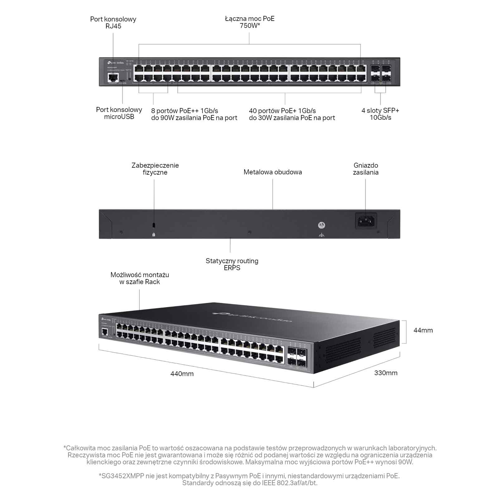 TP-Link TL-SG3452XMPP to zarządzalny przełącznik L2+ Omada, wyposażony w 48x portów Gigabit Ethernet PoE (w tym 40x portów PoE+ i 8x portów PoE++) oraz 4x sloty 10 Gb/s SFP+, port konsolowy RJ45 oraz port konsolowy micro-USB. TL-SG3452XMPP to idealne rozwiązanie dla dostawców usług internetowych ze względu na dostępność następujących funkcji: OAM 802.3ah, sFlow, QinQ, ID Insertion PPPoE L2TP, uwierzytelnianie IGMP i wiele innych. Funkcje OAM 802.3ah oraz Protokół wykrywania połączeń z urządzeniami (DLDP) umożliwiają łatwiejszy nadzór i zarządzanie siecią. Switch posiada 40x portów PoE+ zgodnych ze standardem 802.3af/at oraz 8x portów PoE++ zgodnych ze standardem 802.3af/at/bt. Całkowity budżet mocy PoE w urządzeniu zgodnym są ze standardem zasilania 802.3af/at/bt PoE++ wynosi 750 W, przy czym na każdym porcie PoE+ moc może wynieść maksymalnie 30 W i 90 W na port PoE++. Co ważne, przełącznik posiada funkcję inteligentnego zarządzania zużyciem energii, która chroni urządzenie przed przeciążeniami. Gdy całkowity pobór mocy przekroczy 750 W, automatycznie wyłączone zostanie zasilanie portu o najniższym priorytecie, tak, aby zapewnić zasilanie portów o wyższych priorytetach. Zaprojektowany z myślą o wykorzystaniu pojedynczego kabla Ethernet do transmisji danych i zasilania, przełącznik oferuje elastyczne wdrożenie dla urządzeń obsługujących PoE, takich jak bezprzewodowe punkty dostępowe, kamery IP oraz telefony IP, co obniża koszty infrastruktury dla małych firm.