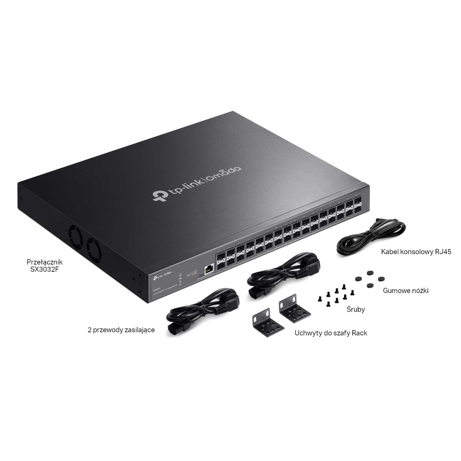 • Przełącznik SX3032F • 2 Przewody zasilające • Instrukcja szybkiej instalacji • Zestaw montażowy do szafy Rack • Gumowe nóżki |