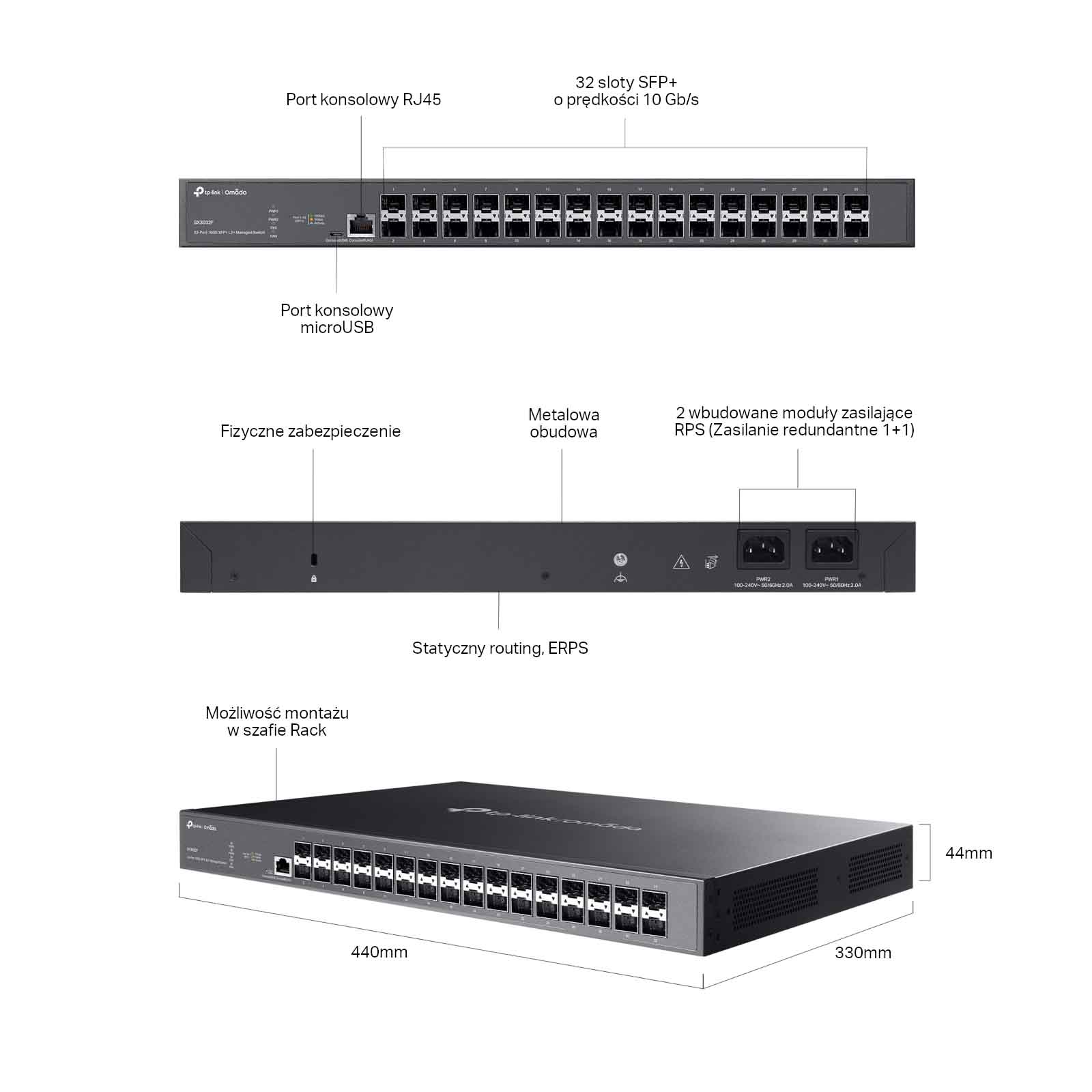 Switch TP-Link SX3032F wyposażony jest w zaawansowane funkcje warstwy 3 (Routing statyczny, Obsługa IPv6, Serwer DHCP, DHCP Relay, Porty IP). Rozbudowane funkcje L2+ i L3 pomagają w budowie wysoce skalowanej i dobrze zabezpieczonej sieci, która jest rozwiązaniem niezawodnym i wydajnym — idealnie sprawdzi się zarówno w biurach, kampusach, jak i do użytku przez usługodawców. Przełącznik SX3032F może być zarządzany klasycznie poprzez graficzny interfejs GUI dostępny z poziomu przeglądarki, poprzez wiersz poleceń, a także centralnie, z poziomu chmury dzięki integracji z platformą Omada SDN. Urządzenie wyposażono w porty konsolowe: RJ45 oraz microUSB. Natomiast dwa redundantne zasilacze wspierające się wzajemnie są idealnym wyborem dla stabilnej architektury sieciowej.