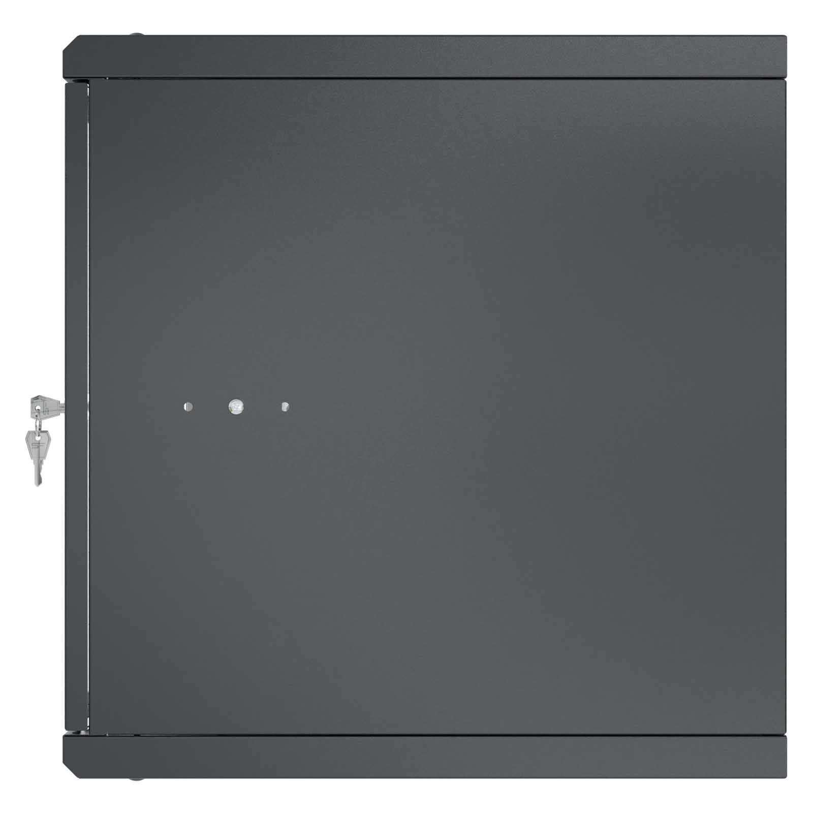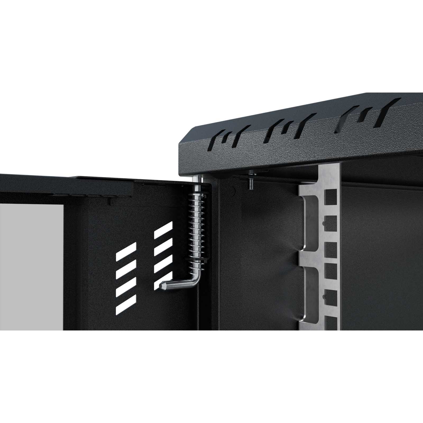 Szafę można łatwo przykręcić za pomocą kołków rozporowych (nie znajdują się w zestawie) dzięki otworom w tylnej części. Szafa umożliwia czteropunktowy montaż do ściany, co zwiększa jej stabilność. Drzwi można zamontować zarówno po prawej, jak i lewej stronie, a dzięki specjalnym zawiasom ze sprężyną ich montaż i demontaż jest niezwykle prosty. Szyny RACK można zamontować na trzech głębokościach, co pozwala na swobodne dopasowanie do urządzeń wewnątrz. W górnej i dolnej części znajdują się miejsca na wentylatory 120x120 mm (rozstaw otworów 105x105 mm), co zapewnia odpowiednie chłodzenie urządzeń. Dodatkowo, wyłamywane przepusty kablowe 50x80 mm (3 sztuki w górnej i 3 sztuki w dolnej części) ułatwiają zarządzanie okablowaniem. Szafa jest wyposażona w perforacje od frontu i po bokach, co jest kluczowe dla odprowadzania ciepła.