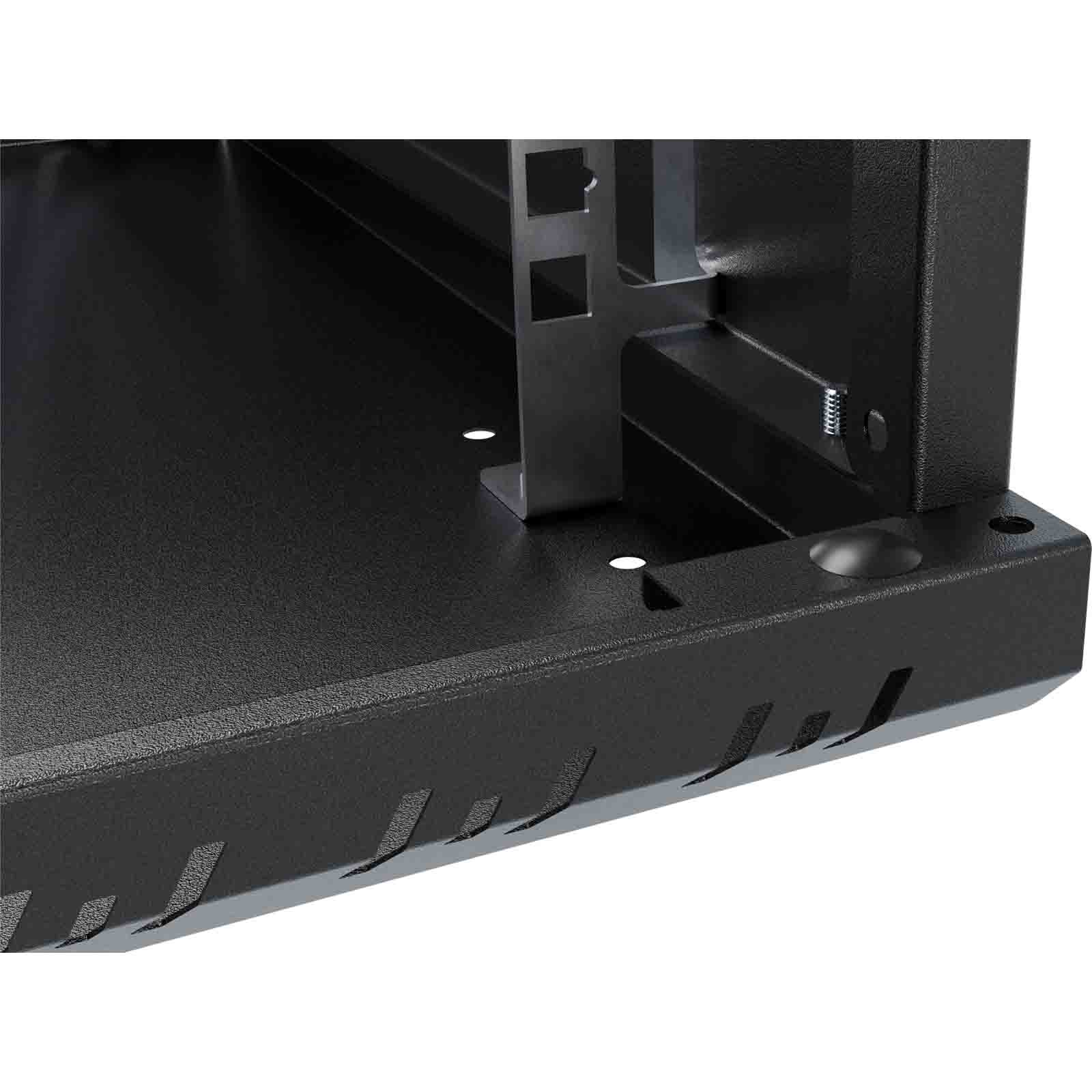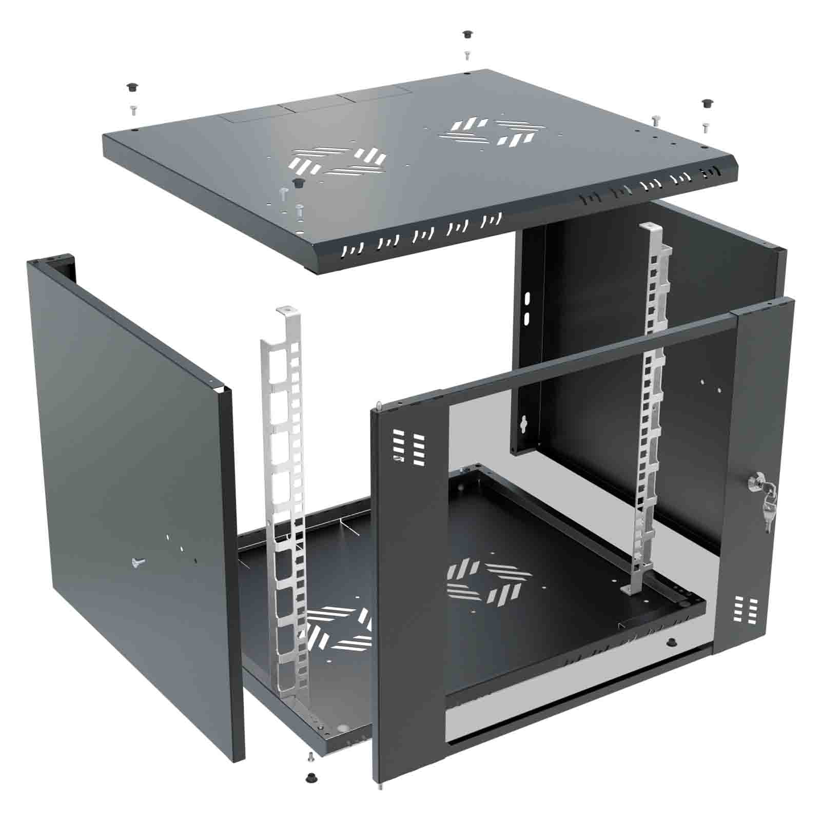 Szafa wykonana jest z blachy, która gwarantuje sztywność, a jednocześnie jest na tyle lekka, że jedna osoba może przeprowadzić instalację. Celowe usunięcie tylnej ściany umożliwia wygodną modernizację oraz zapewnia łatwy dostęp do okablowania wychodzącego ze ściany. Liczne otwory w szynach RACK pozwalają na łatwe przeprowadzenie okablowania. Dzięki swojej kompaktowej szerokości wynoszącej zaledwie 520 mm, szafa idealnie nadaje się do miejsc o ograniczonej przestrzeni, pozostając w pełni funkcjonalną.