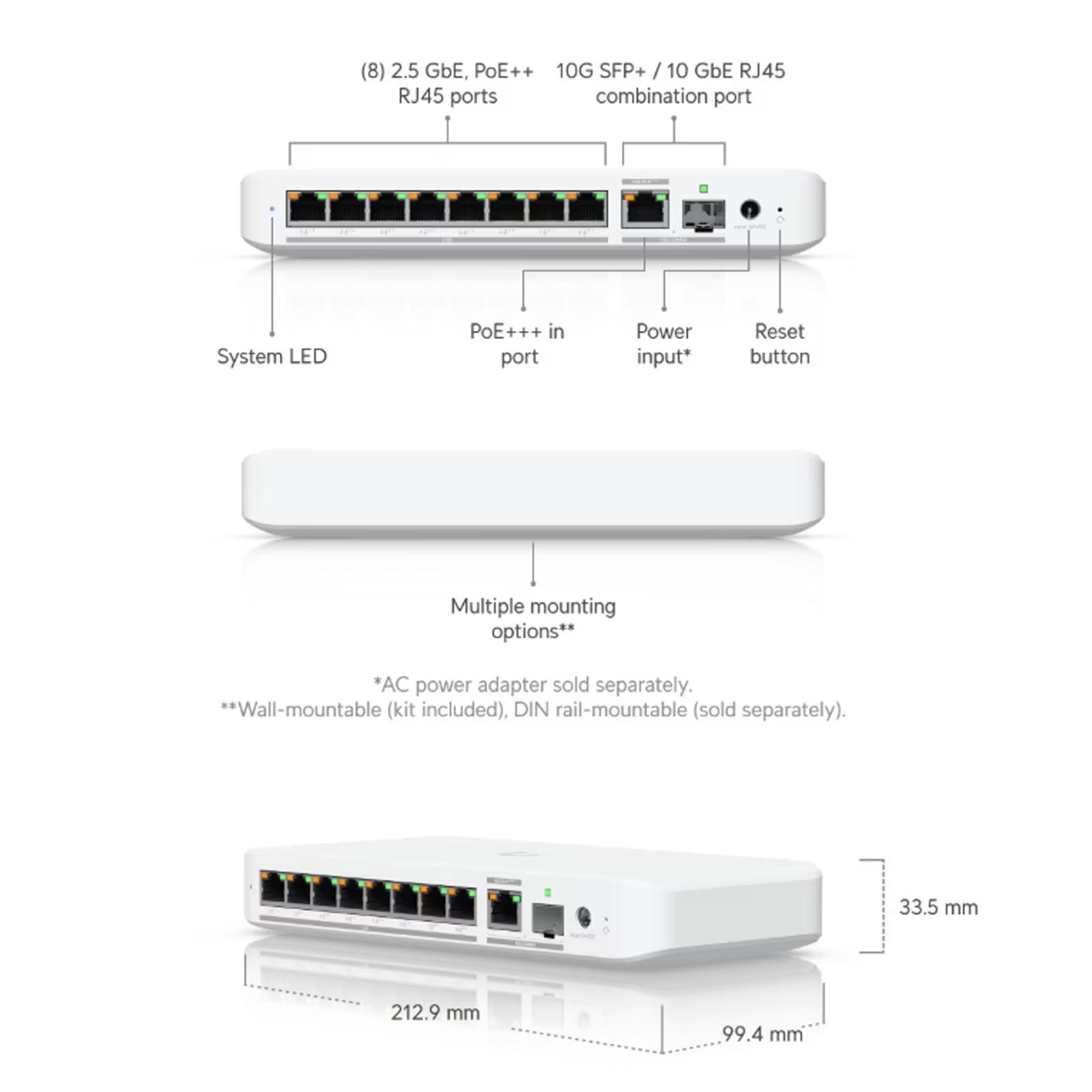 Zaprojektowany z myślą o elastyczności PoE, USW-Flex-2.5G-8-PoE obsługuje wiele standardów PoE, aby spełnić różne wymagania dotyczące zasilania. Przy zasilaniu przez port uplink 10 GbE RJ45 z wejściem PoE++, przełącznik oferuje do 76 W mocy PoE dla podłączonych urządzeń. Alternatywnie, z wejściem PoE++, zapewnia do 46 W, a z wejściem PoE+, do 16 W. Aby uzyskać maksymalną dostępność PoE wynoszącą 196 W, można użyć opcjonalnego zasilacza sieciowego 210 W, zapewniając wystarczającą moc dla urządzeń o dużym zapotrzebowaniu.