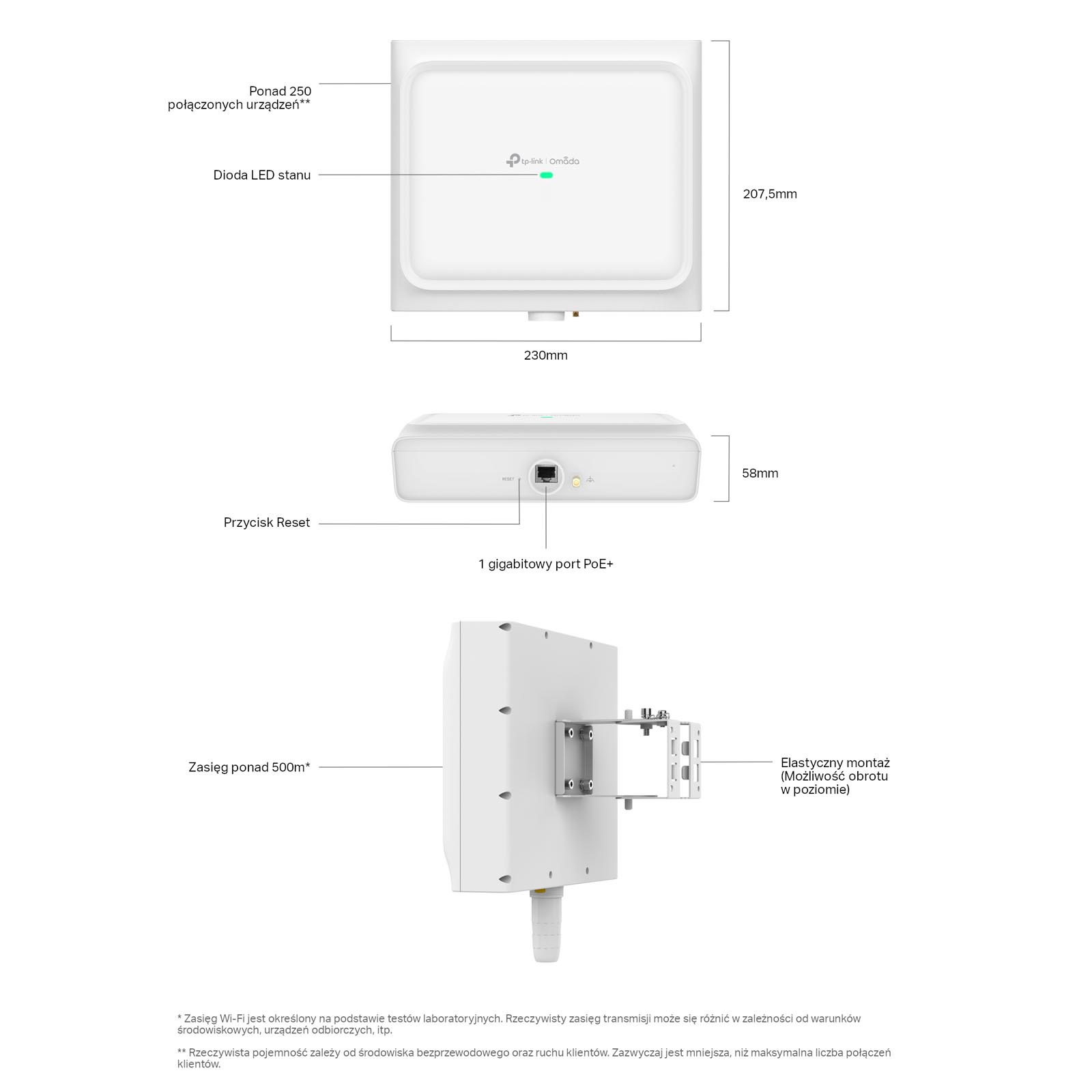 - Elastyczne wdrożenie: Obsługuje PoE 802.3at oraz technologię Omada Mesh
