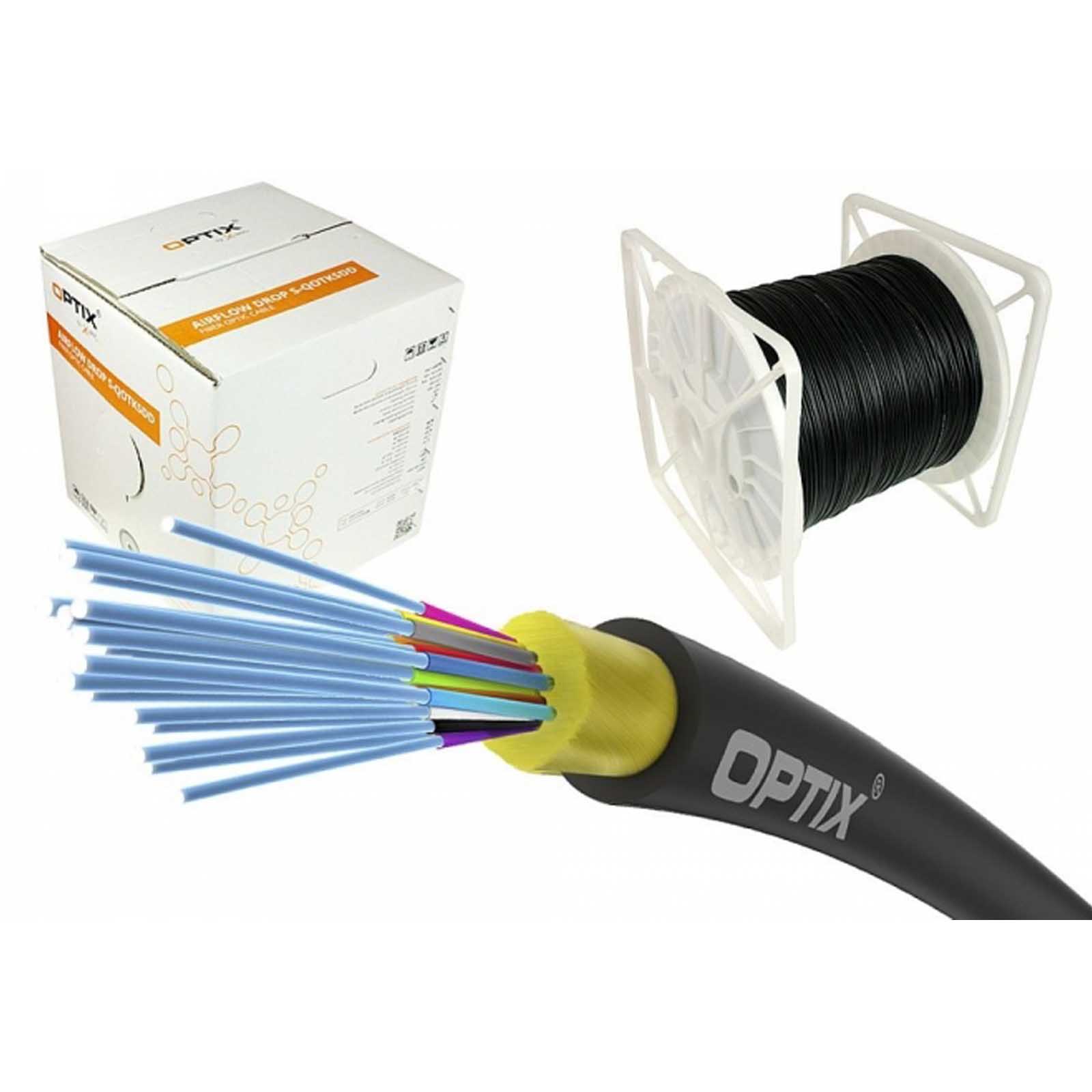 OPTIX kabel AirFlow S-QOTKSdD to uniwersalne (zewnętrzno-wewnętrzne), okrągłe samonośne kable do zastosowania w systemach FTTx, wzmacniane włóknami aramidowymi (element nośny w instalacjach napowietrznych), lekka konstrukcja o małej średnicy ~ 4mm duża giętkość i odporność na przeciąganie, płaszcz PU, powłoka odporna na UV, całkowicie dielektryczne, siła naciągu instalacyjna: 800N, zakres temperaturowy od -20…+70 [°C] - odpowiednik: S-QOTKSdD.