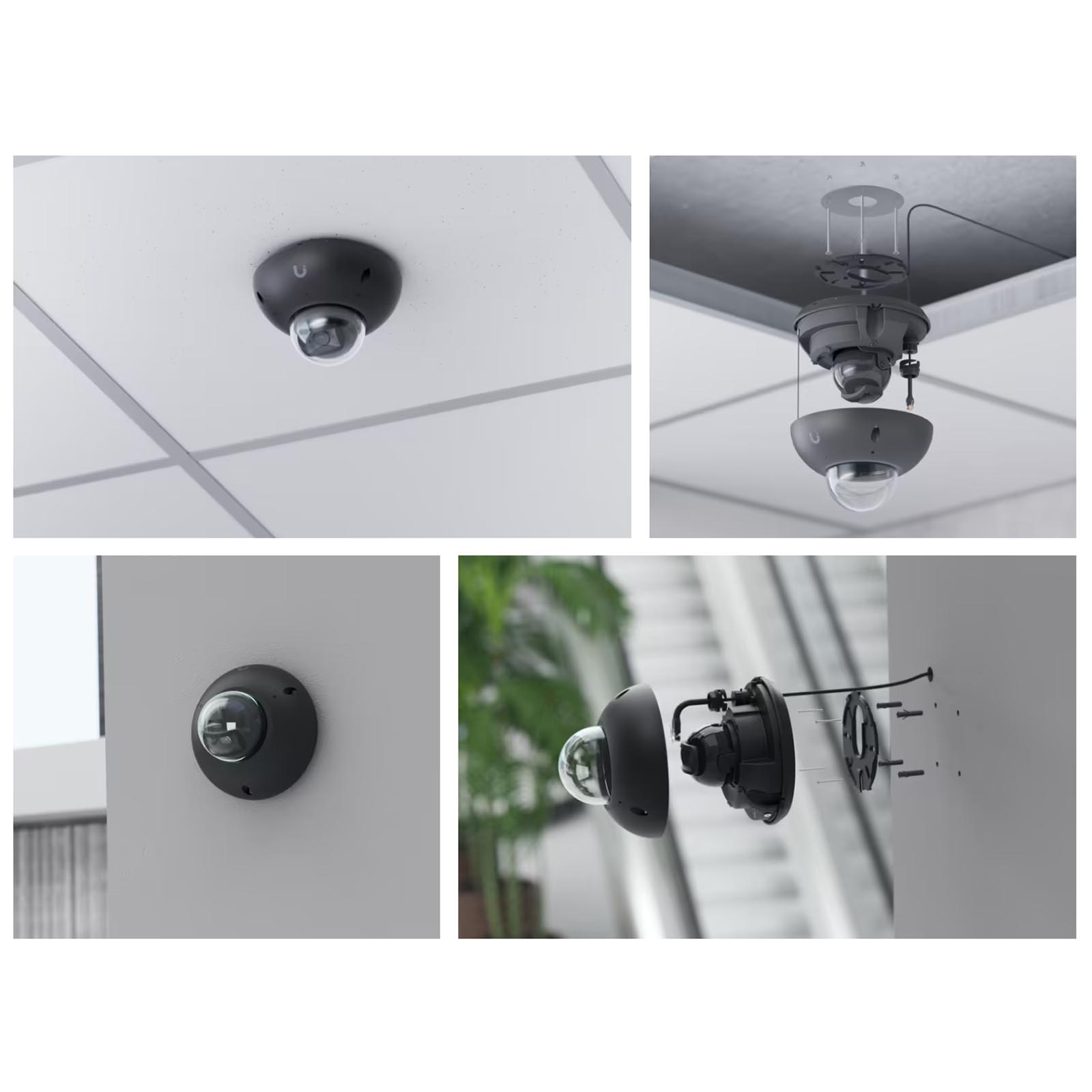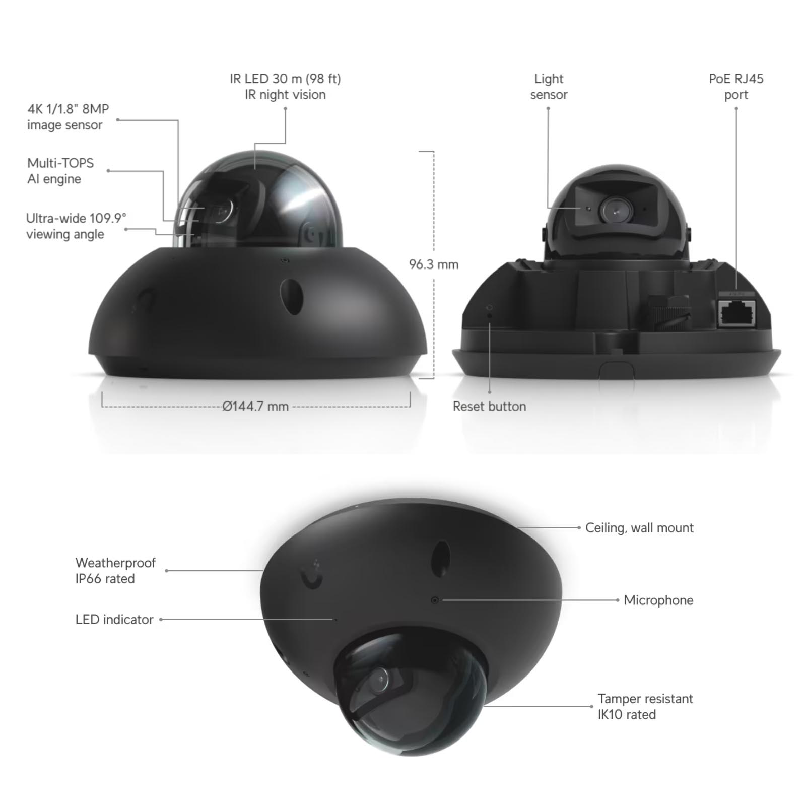 Ubiquiti UniFi Enterprise G6 Dome to urządzenie z serii Enterprise, przeznaczone do środowisk biznesowych. G6 Dome to zewnętrzna kamera typu DOME wyposażona w matrycę 8 MP (3840 x 2160 przy 30 klatkach na sekundę) o rozmiarze 1/1,8 cala oraz stały obiektyw o poziomej szerokości pola widzenia 109,9°. Wbudowany iluminator IR umożliwia kamerze rejestrowanie scen nocnych w odległości do 30 metrów. Kamera jest również wyposażona w mikrofon do nagrywania dźwięków otoczenia. Obsługuje również silnik Multi-TOPS AI, który w połączeniu z dalekosiężnym oświetleniem IR stwarza idealne warunki do dyskretnej instalacji w miejscach o dużym natężeniu ruchu.