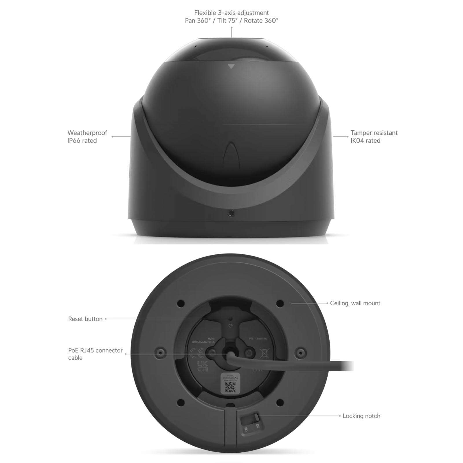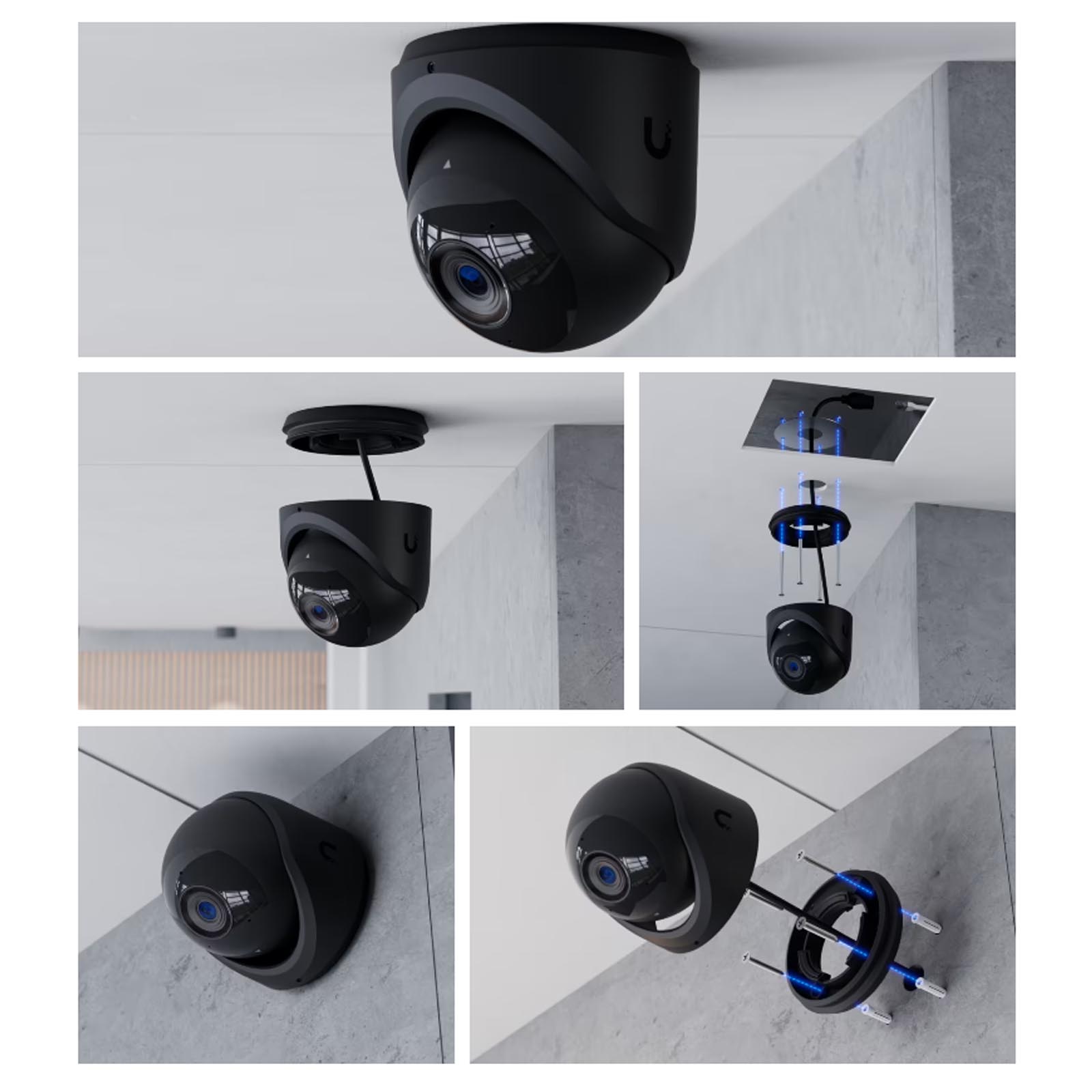 Zaprojektowana do użytku na zewnątrz kamera UVC-G6-Turret-W posiada obudowę o stopniu ochrony IP66, chroniącą ją przed kurzem i ulewnym deszczem. Jej odporność na uderzenia na poziomie IK04 zapewnia trwałość w przypadku aktów wandalizmu. Kamera działa niezawodnie w temperaturach od -30°C do 50°C i przy wilgotności do 90% (bez kondensacji). Obsługuje technologię Power over Ethernet (PoE) w zakresie napięcia 37–57 V DC i maksymalnym poborze mocy 12,5 W. Opcje montażu obejmują instalację sufitową i ścienną, a dodatkowe akcesoria umożliwiają montaż na ramieniu, zawieszeniu lub skrzynce przyłączeniowej, zapewniając elastyczność w różnych scenariuszach wdrożeniowych.
