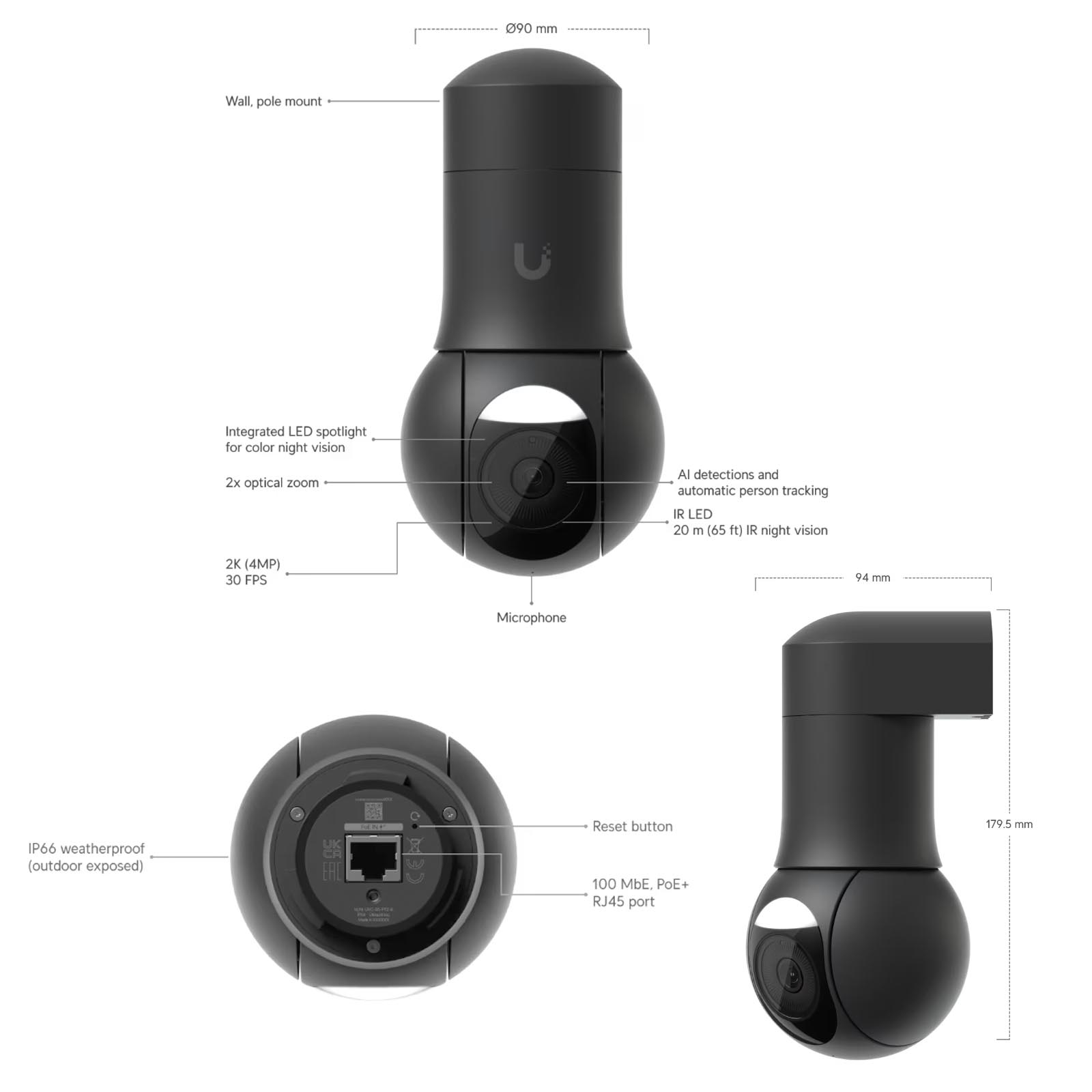 Kamera UniFi Protect G5 PTZ ma rozdzielczość 2K, co zapewnia ładny obraz. Posiada również dwukrotny zoom optyczny. W nocy wykorzystuje się noktowizję na podczerwień o zasięgu do 20 metrów, a w pozostałych przypadkach zintegrowany reflektor LED do kolorowego widzenia w nocy. Obsługuje wykrywanie zdarzeń AI i automatyczne śledzenie osób. Posiada ochronę antywandalową IK04. Kamera jest również odporna na warunki atmosferyczne i posiada certyfikat IP66.