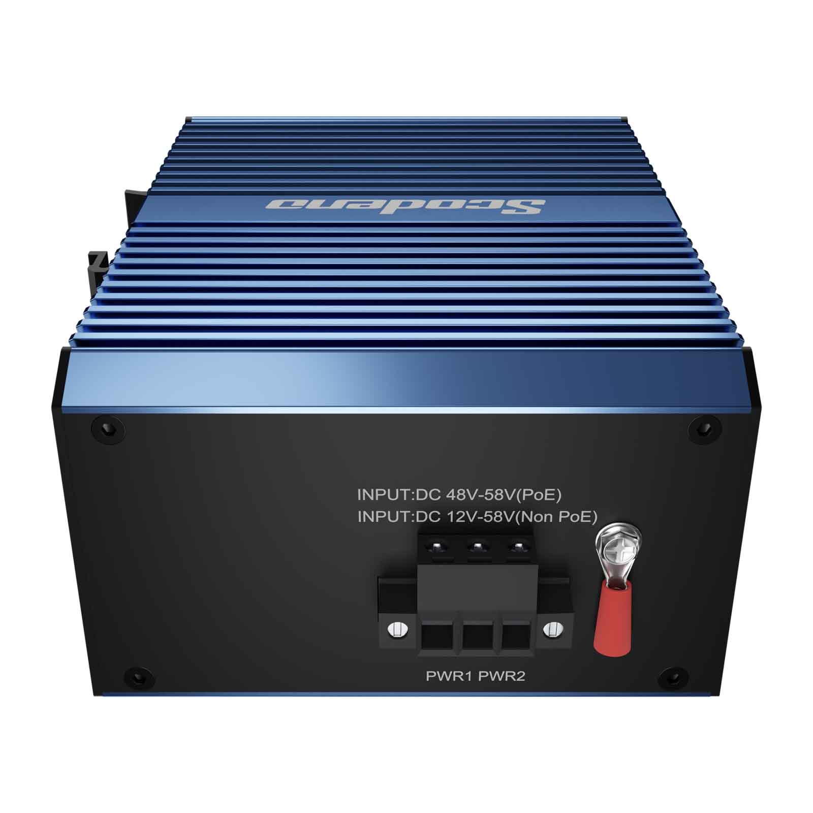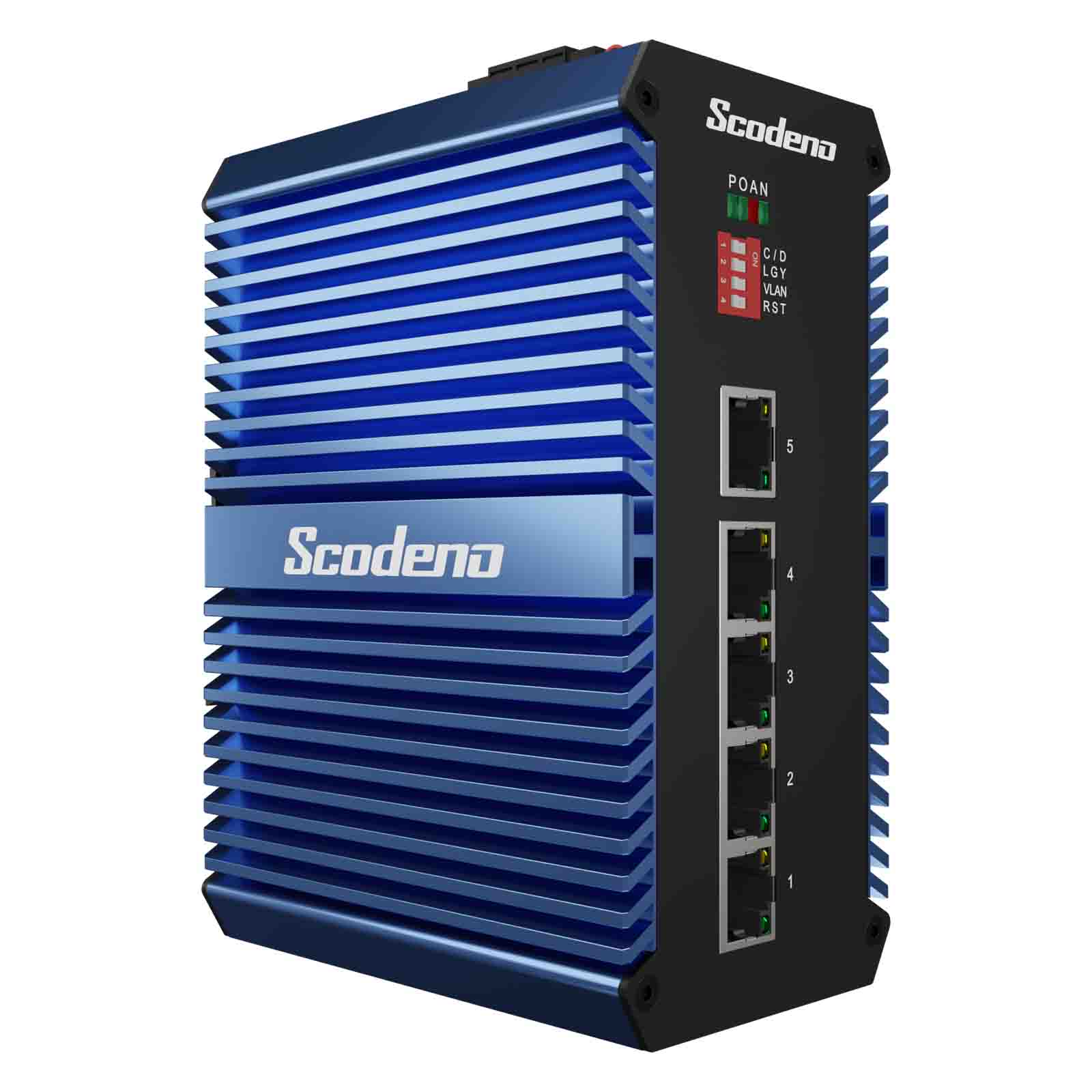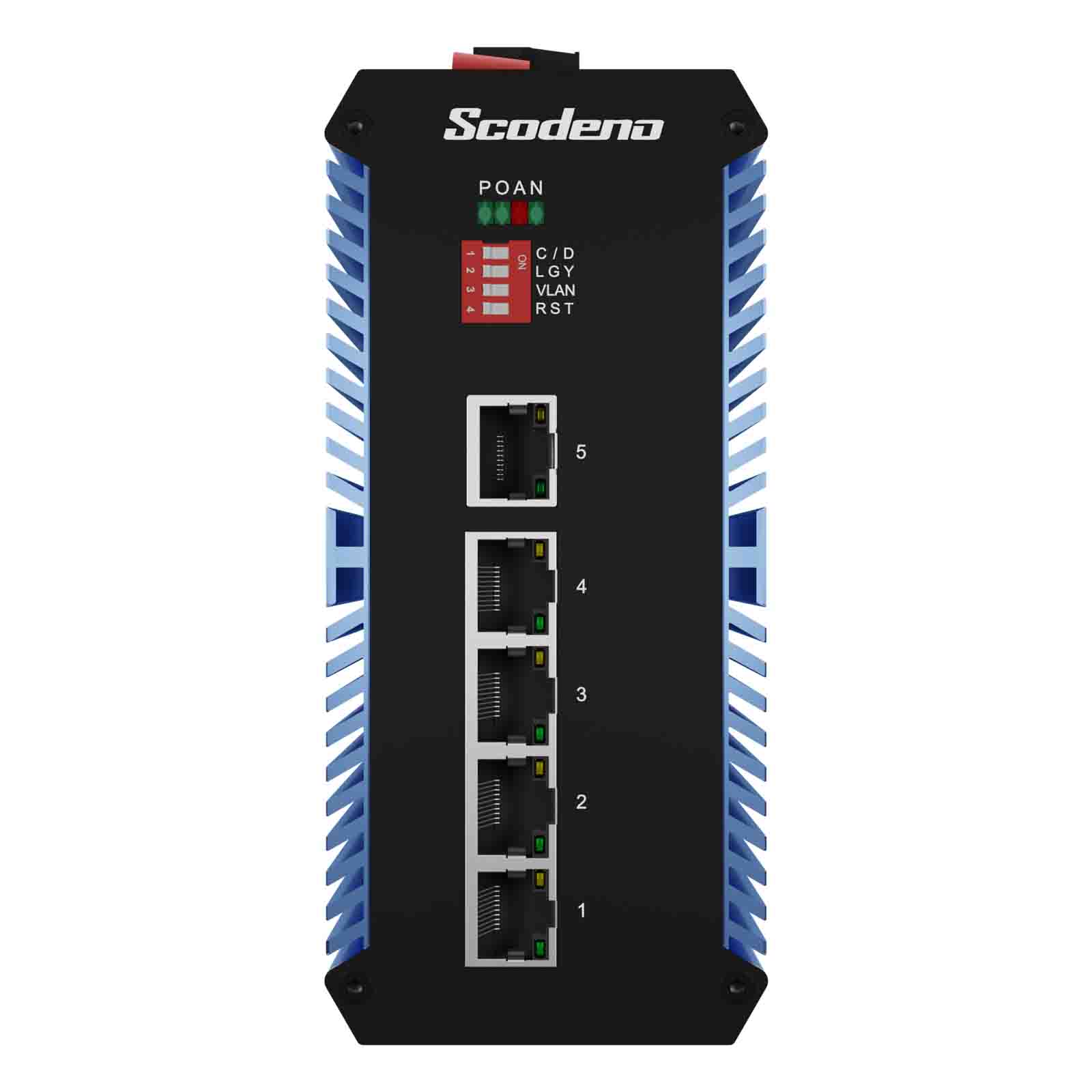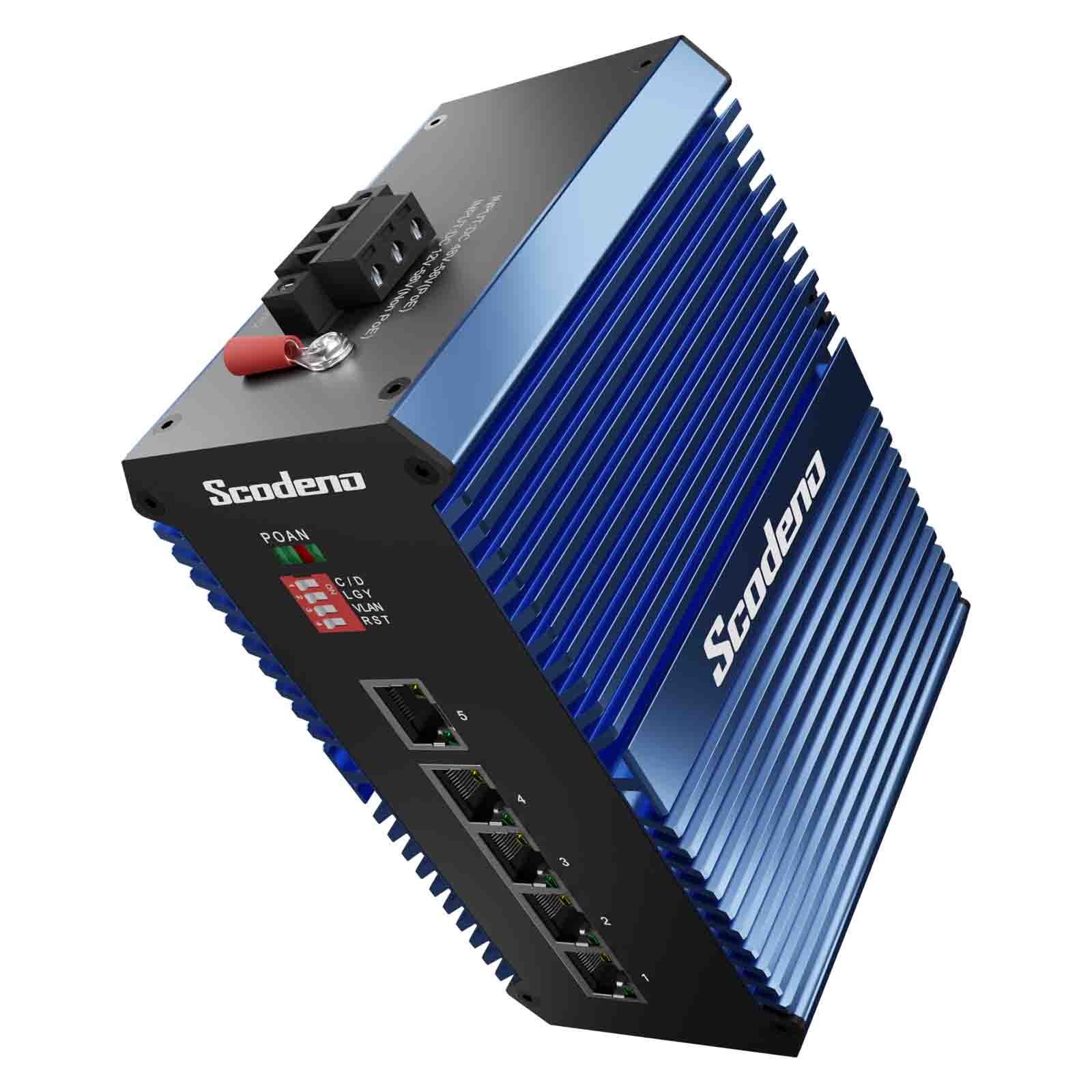 Przemysłowe przełączniki Ethernet PoE marki Scodeno posiadają bezwentylatorową konstrukcję obwodu rozpraszania ciepła, szeroki zakres temperatur środowiska pracy oraz wysoki poziom ochrony (odporność na wstrząsy, pyłoszczelność itp). Switche zapewniają doskonałą jakość przemysłową z odpornością na wysokie i niskie temperatury, ochronę odgromową oraz zwiększoną niezawodność i bezpieczeństwo sieci przemysłowych.