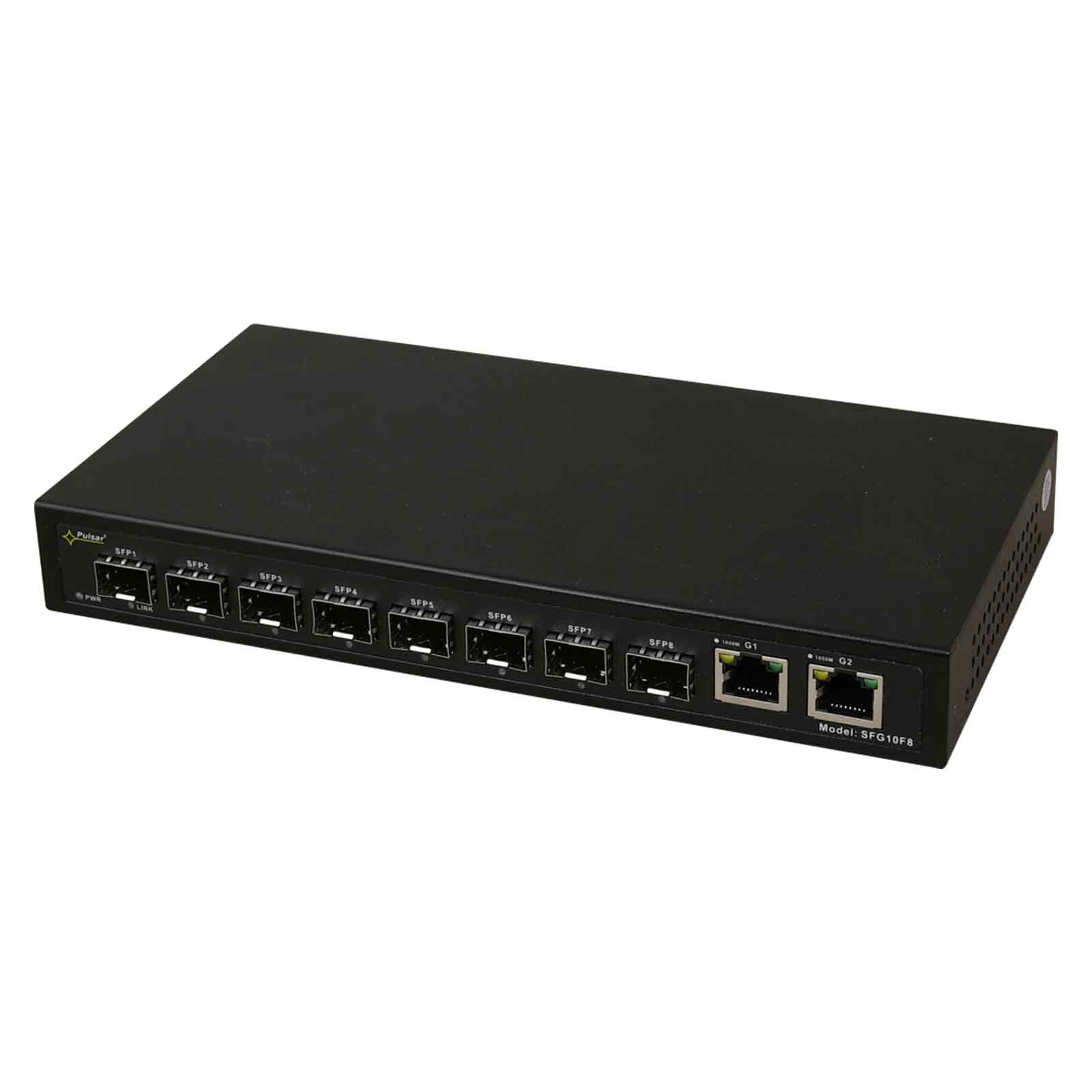 Pulsar SFG10F8 to 10-portowy switch optyczny przeznaczony do transmisji danych w sieci Ethernet za pomocą przewodów światłowodowych oraz przewodów ethernetowych. Switch SFG10F8 posiada 8x slotów SFP (oznaczone SFP1 ÷ SFP8), które po zastosowaniu modułu światłowodowego (wkładka GBIC) umożliwiają transmisję po światłowodzie. Posiada również 2x porty Gigabit Ethernet 10/100/1000 Mb/s (porty G1 i G2), które służą do podłączenia kolejnych urządzeń sieciowych poprzez złącze RJ45. Na panelu przednim znajduje się sygnalizacja stanu pracy urządzenia zrealizowana na diodach LED. Łączność za pomocą przewodów światłowodowych pozwala na szybką i stabilną transmisję danych na dalekie odległości, odporną na zakłócenia elektromagnetyczne i niekorzystne warunki środowiskowe. Umożliwia również łatwą rozbudowę sieci w przyszłości. Najważniejsze cechy: