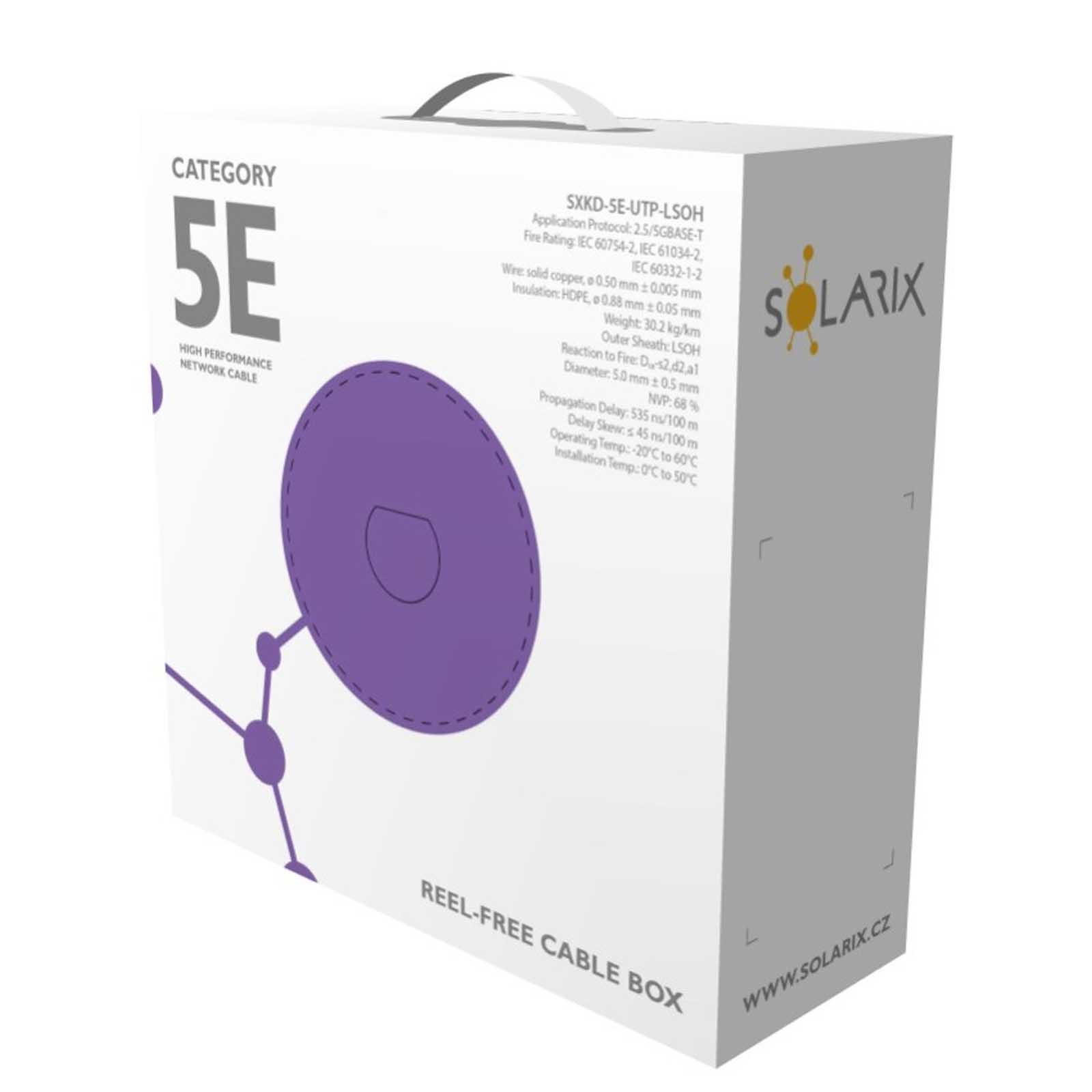 Przewód UTP Solarix SXKD-5E-UTP-LSOH to wysokiej jakości kabel nieekranowany CAT5E z płaszczem LSOH i klasą reakcji na ogień Dca s1 d2 a1, sprzedawany w boxie 100 m.