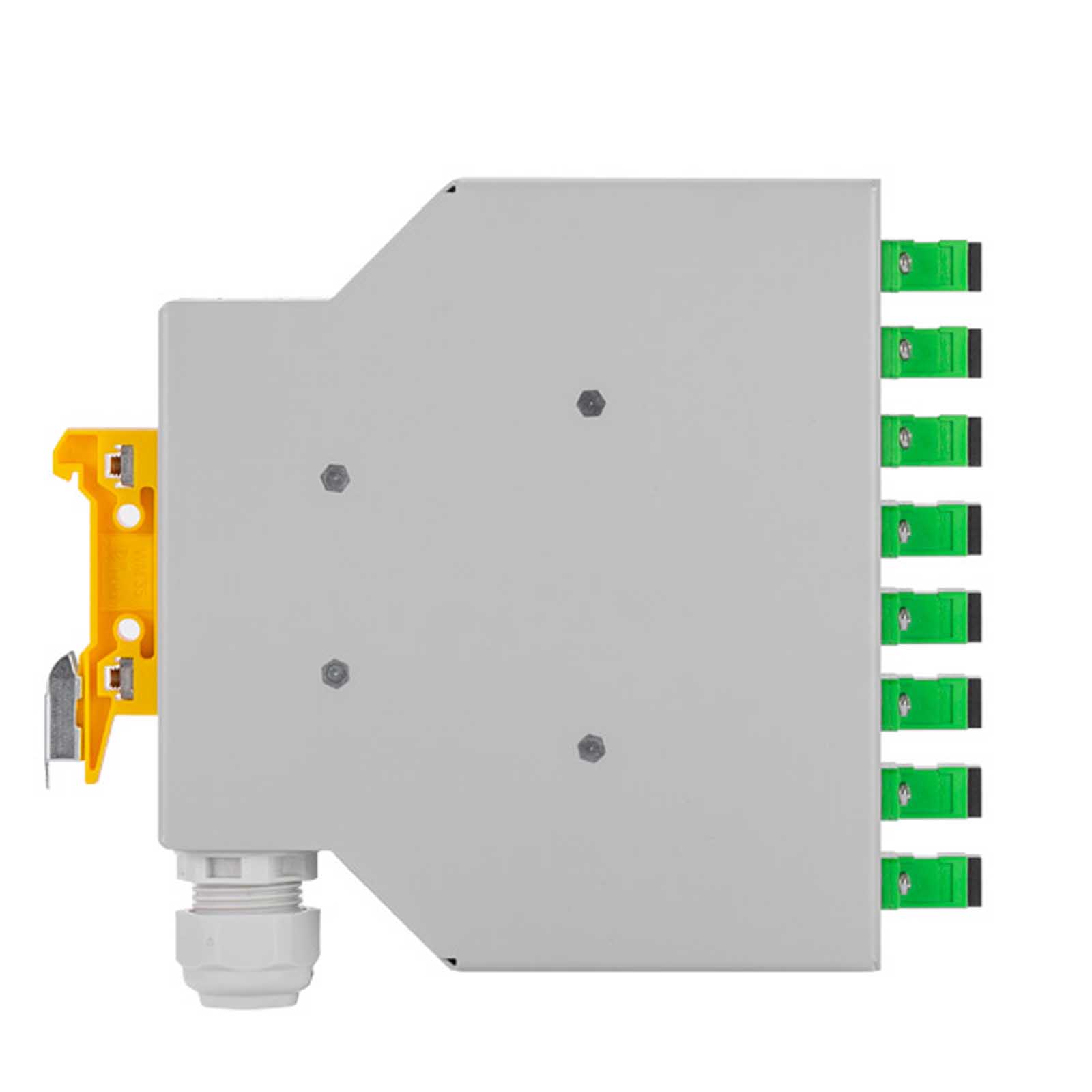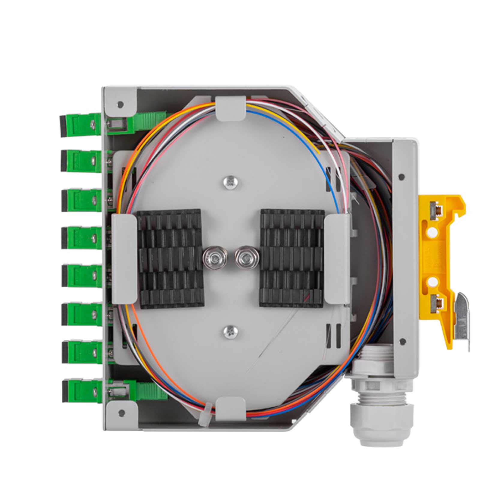 Przełącznica światłowodowa ODF na szynę DIN 8xSC simplex to przełącznica światłowodowa na szynę DIN z panelem 8xSC simplex przeznaczona do zakończenia kabla światłowodowego i spawania włókien z pigtailami do montażu na szynie w standardzie DIN (TH35, TS35, DIN-3).