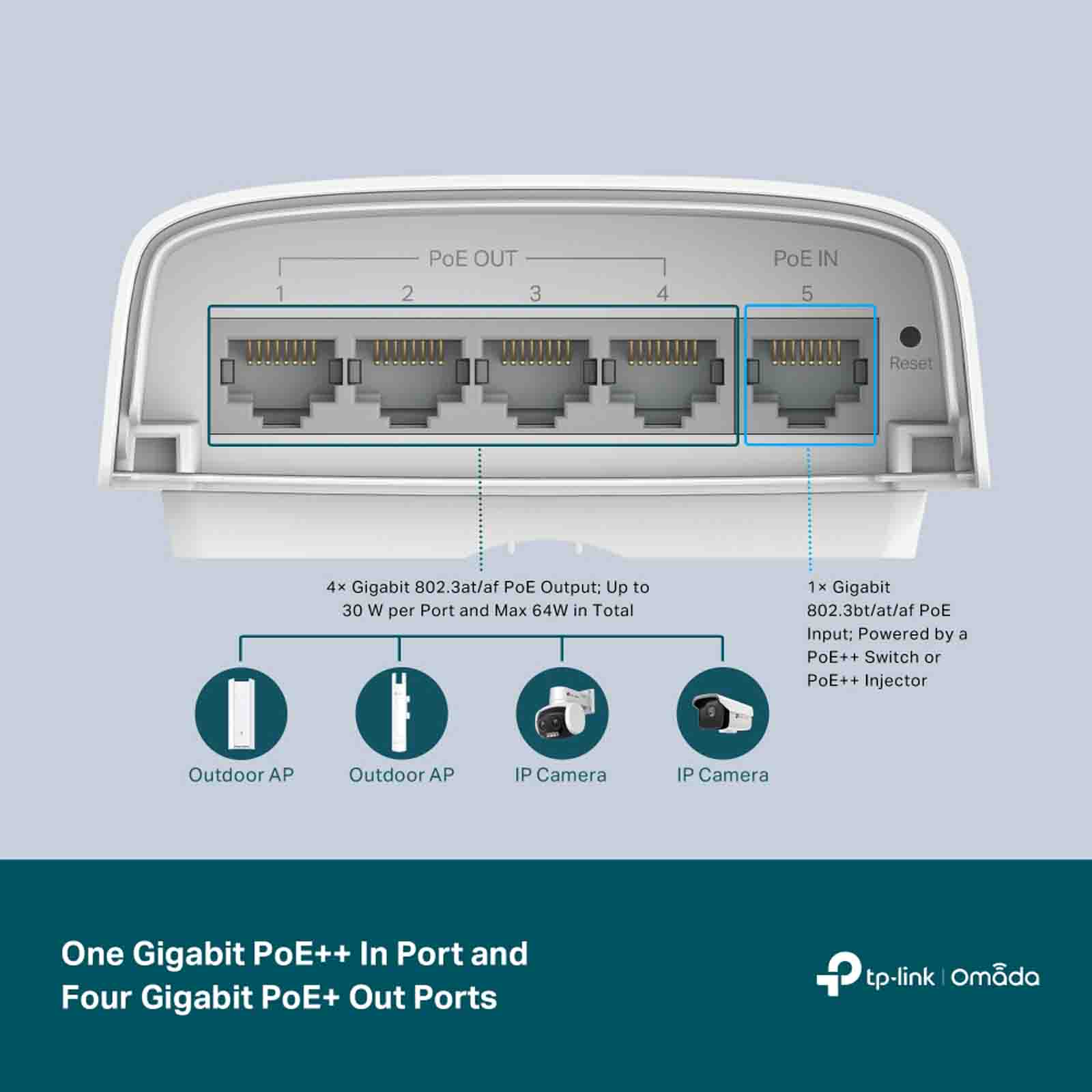 • 1x port PoE IN RJ45 10/100/1000 Mb/s RJ45 PoE (zgodny z 802.3af/at/bt) • 4x porty PoE OUT RJ45 10/100/1000 Mb/s (zgodne z 802.3af/at PoE) |